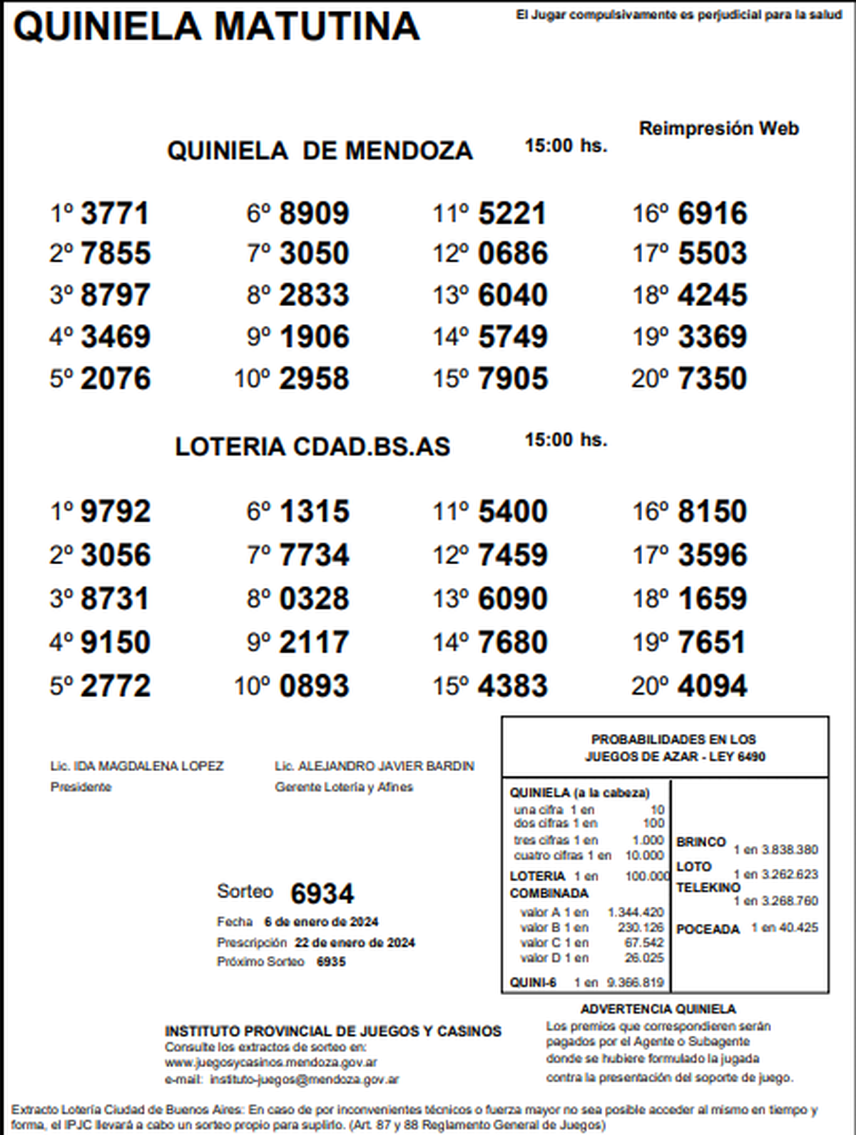 Resultados Quiniela de Mendoza: La Matutina del 6 de enero 2024