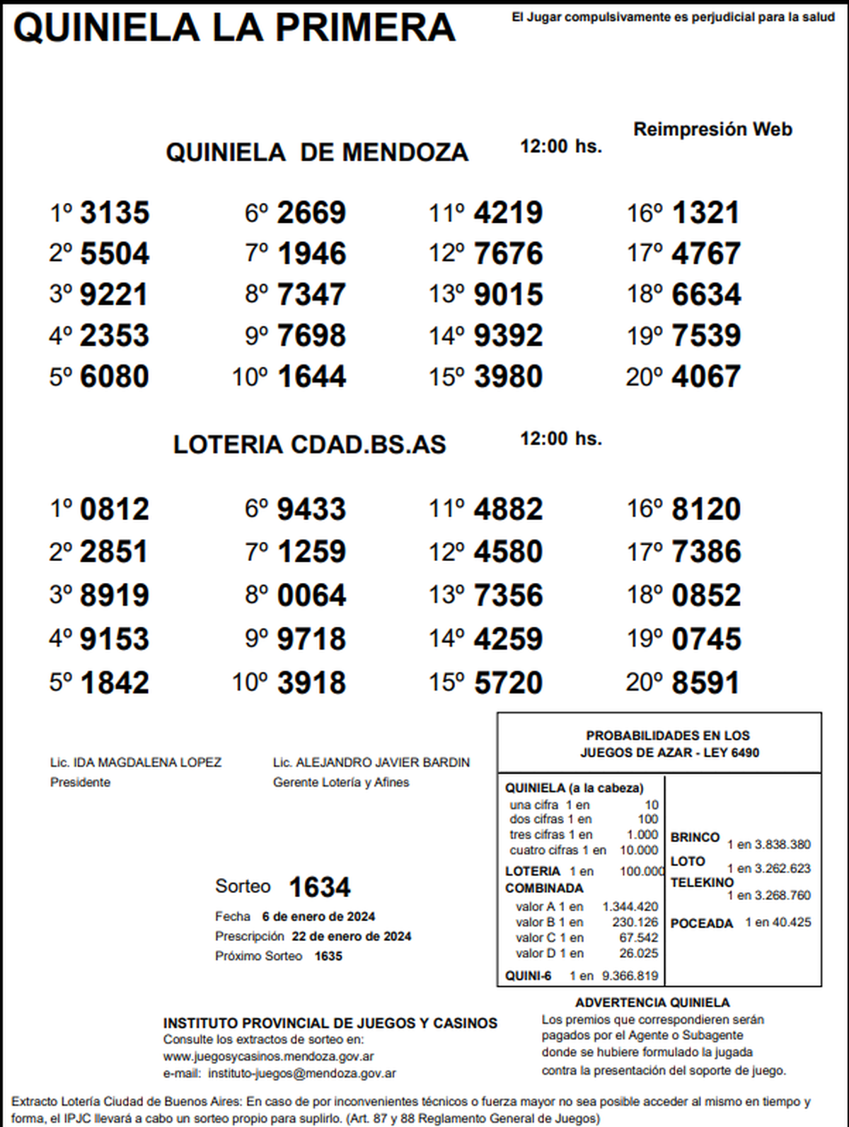 Resultados Quiniela de Mendoza: La Primera del 6 de enero 2024