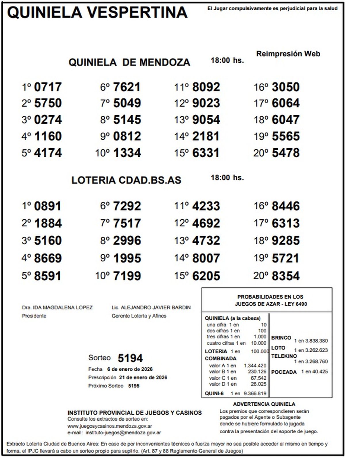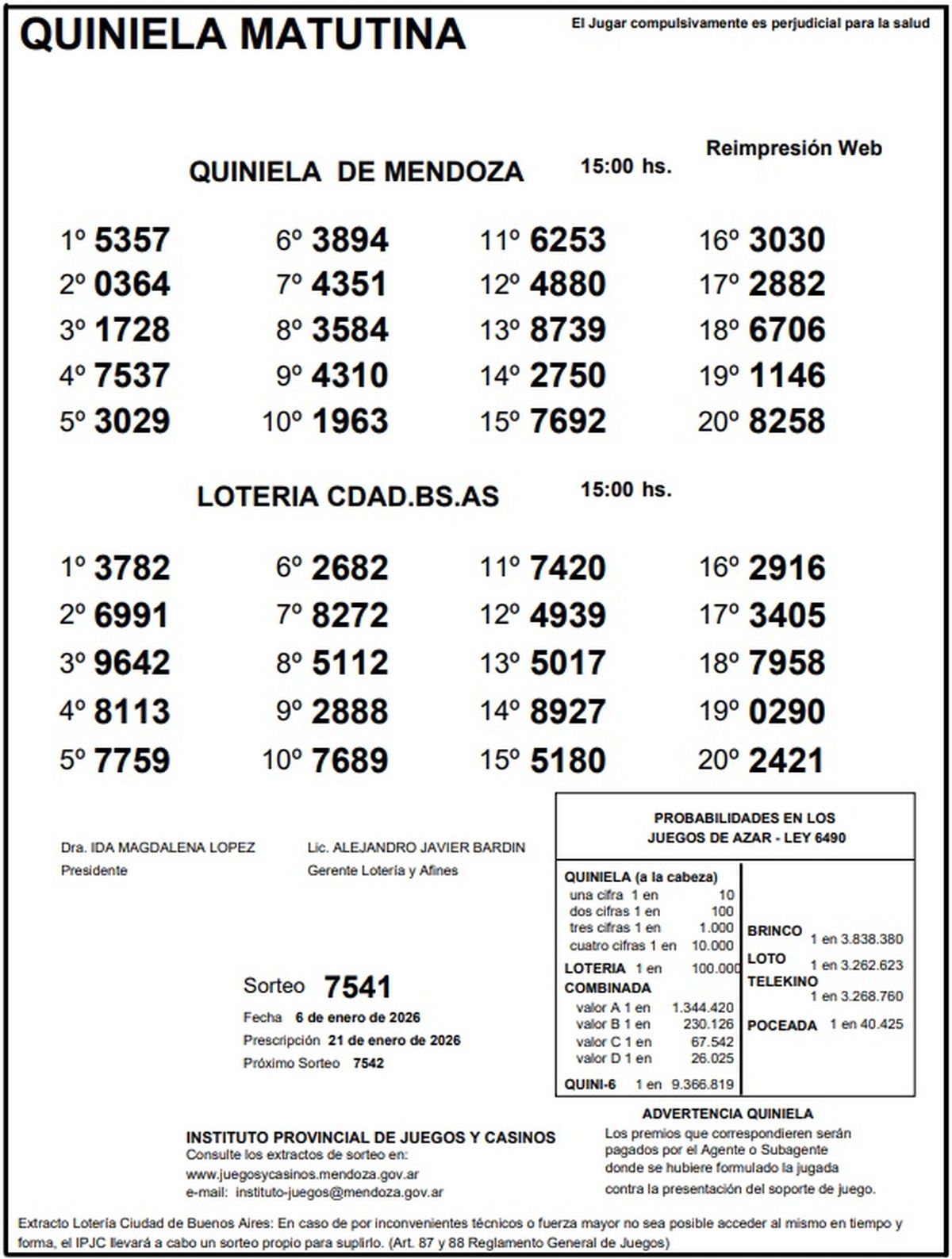 Resultados Quiniela de Mendoza: La Matutina del 6 de enero de 2026