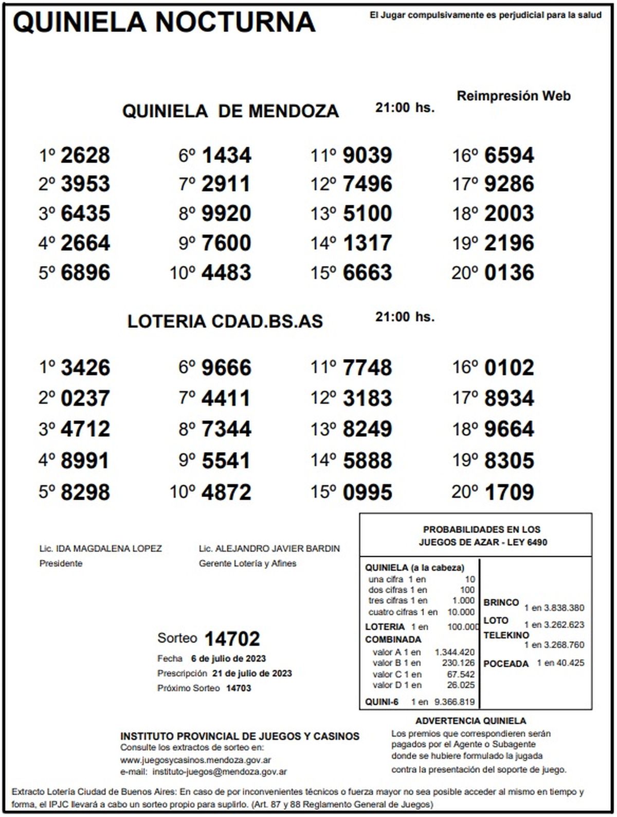 Quiniela de Mendoza: resultados de la Nocturna de hoy, 6 de julio de 2023