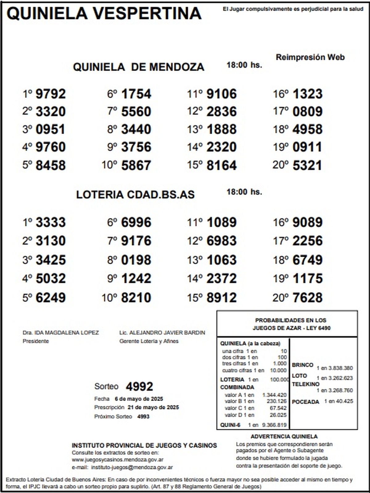Resultados Quiniela de Mendoza: La Vespertina del 6 de mayo de 2025