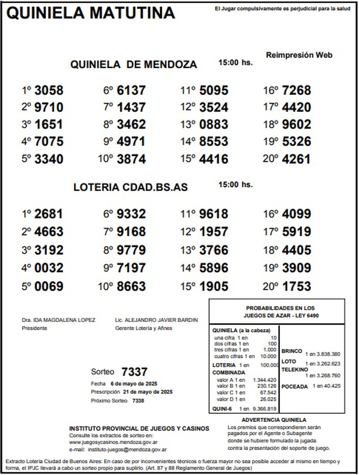 Resultados Quiniela de Mendoza: La Matutina del 6 de mayo de 2025