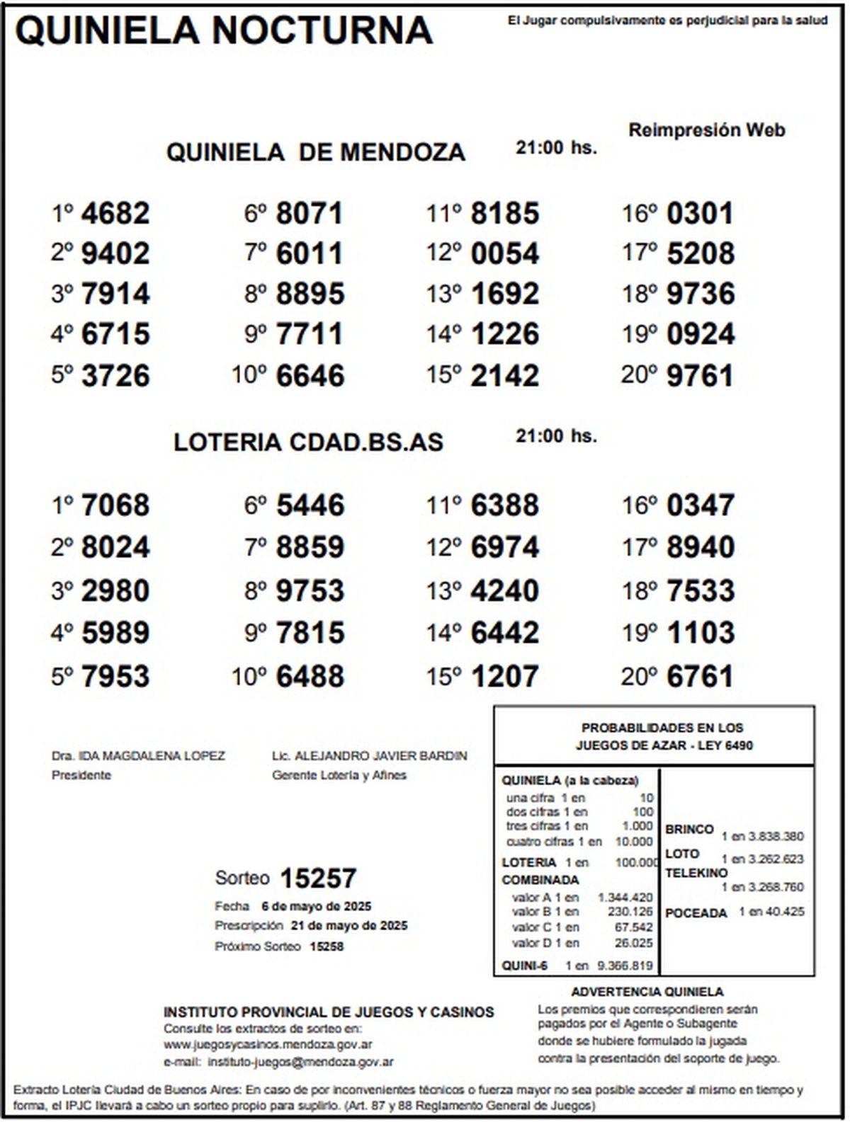 Quiniela de Mendoza: resultados de la Nocturna de hoy, 6 de mayo de 2025