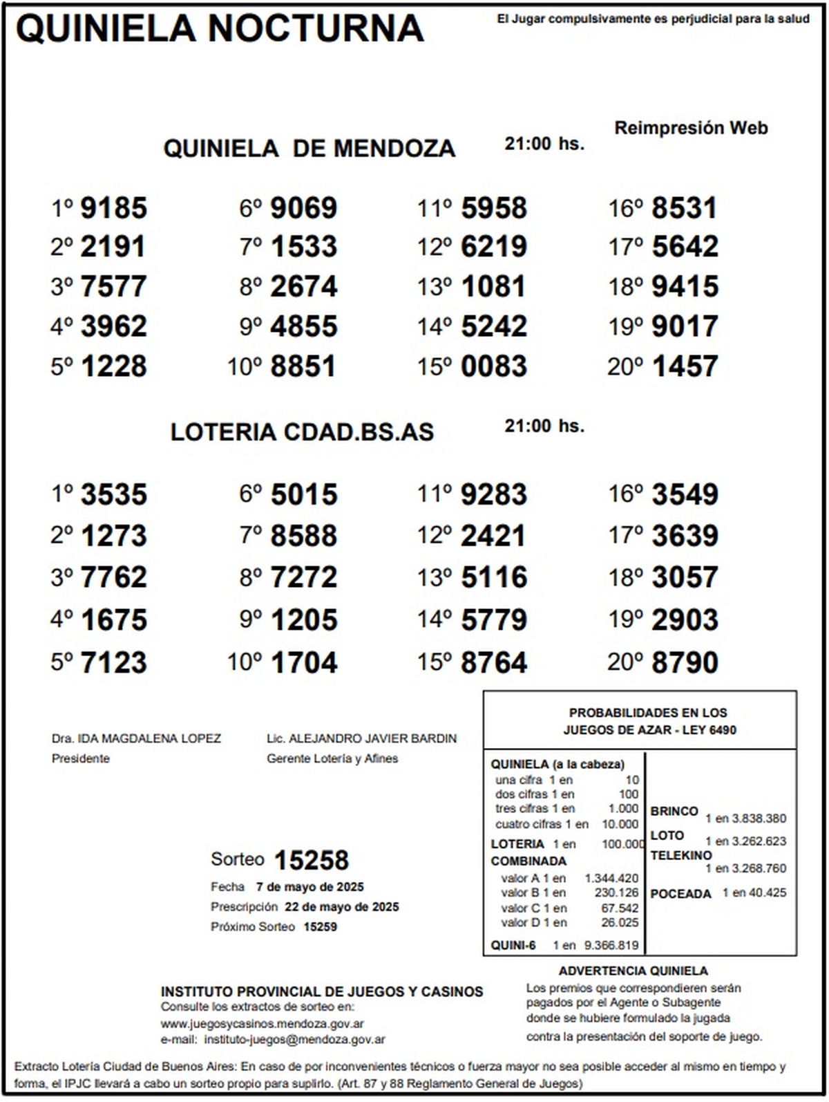 Quiniela de Mendoza: resultados de la Nocturna de hoy, 7 de mayo de 2025