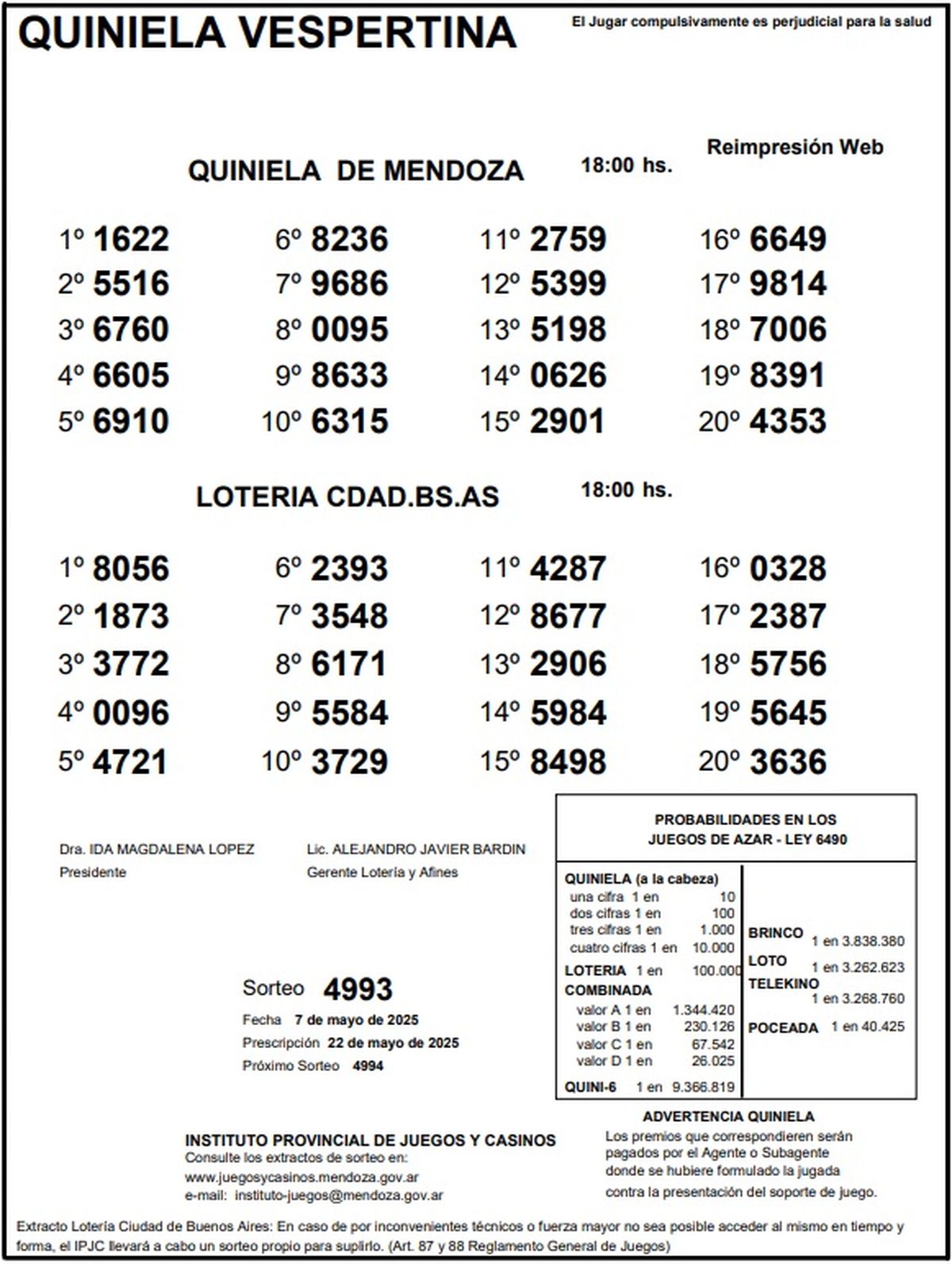 Resultados Quiniela de Mendoza: La Vespertina del 7 de mayo de 2025
