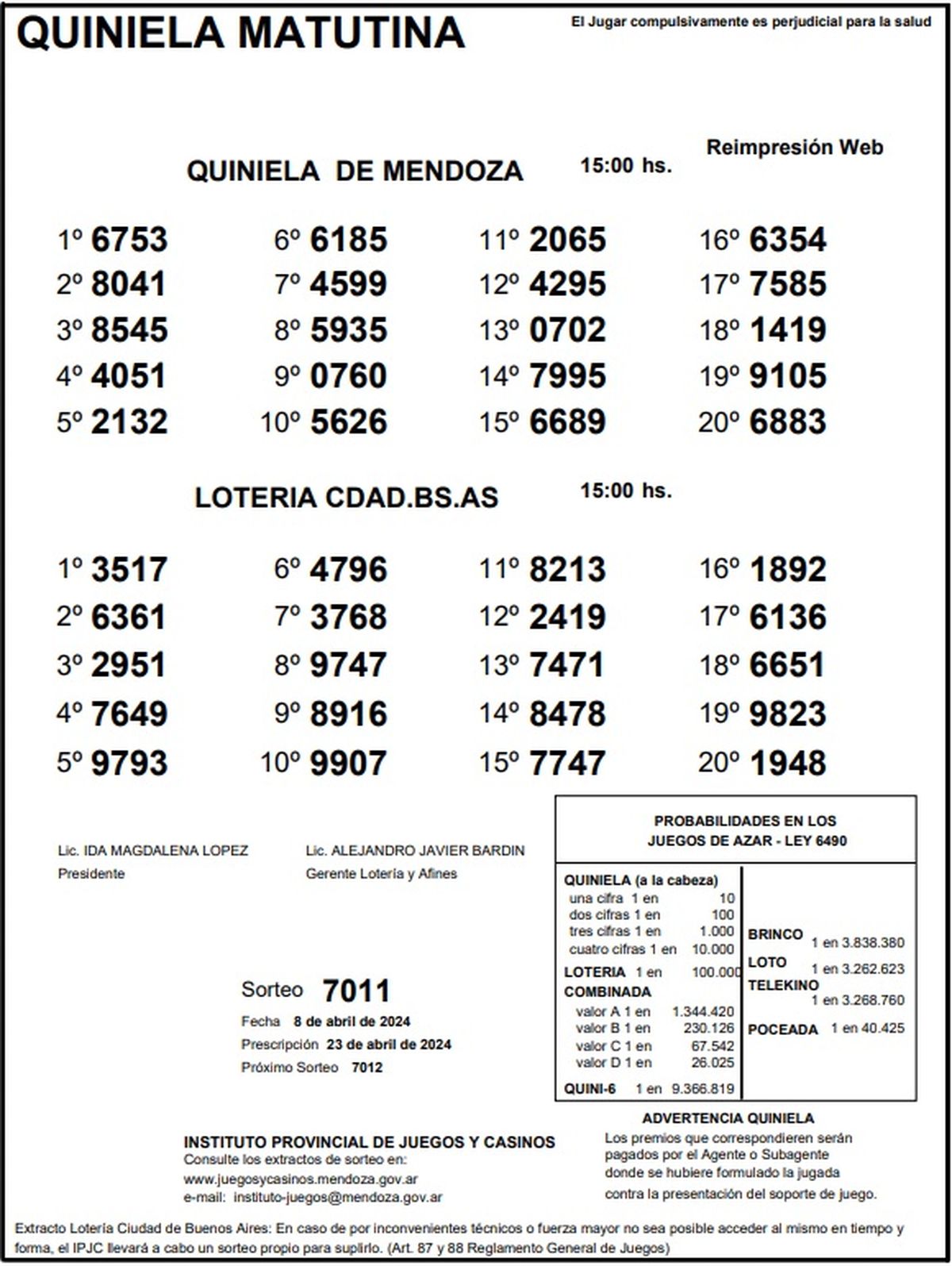 Resultados Quiniela de Mendoza: La Matutina del 8 de abril 2024