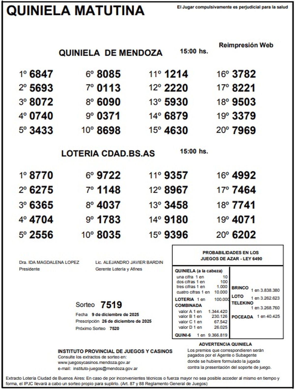Resultados Quiniela de Mendoza: La Matutina del 9 de diciembre de 2025