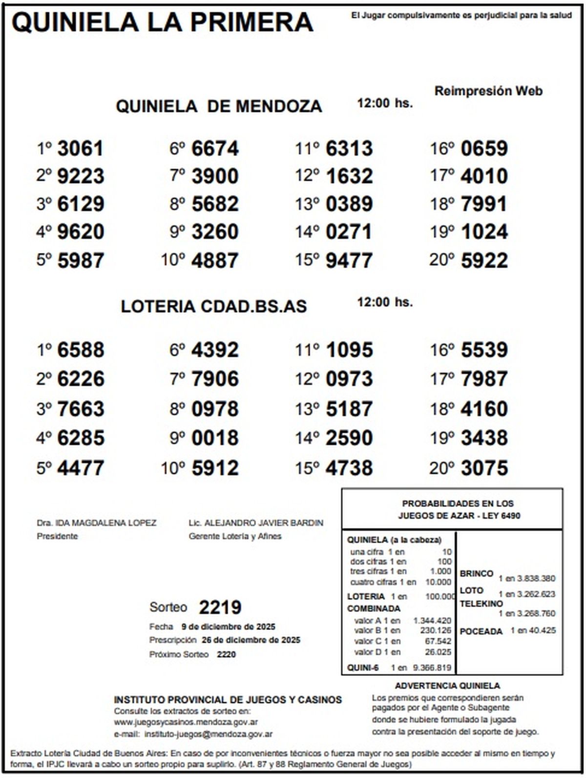 Resultados Quiniela de Mendoza: La Primera del 9 de diciembre de 2025