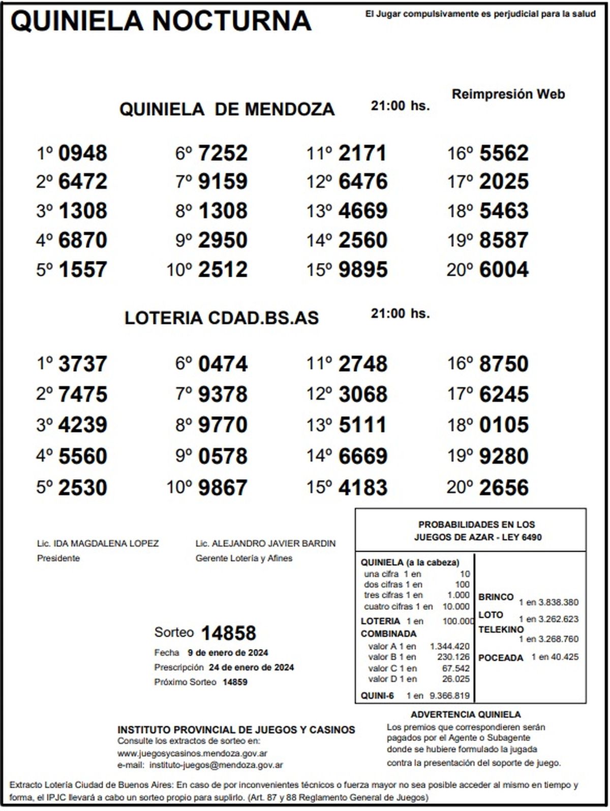 Quiniela de Mendoza: resultados de la Nocturna de hoy, 9 de enero