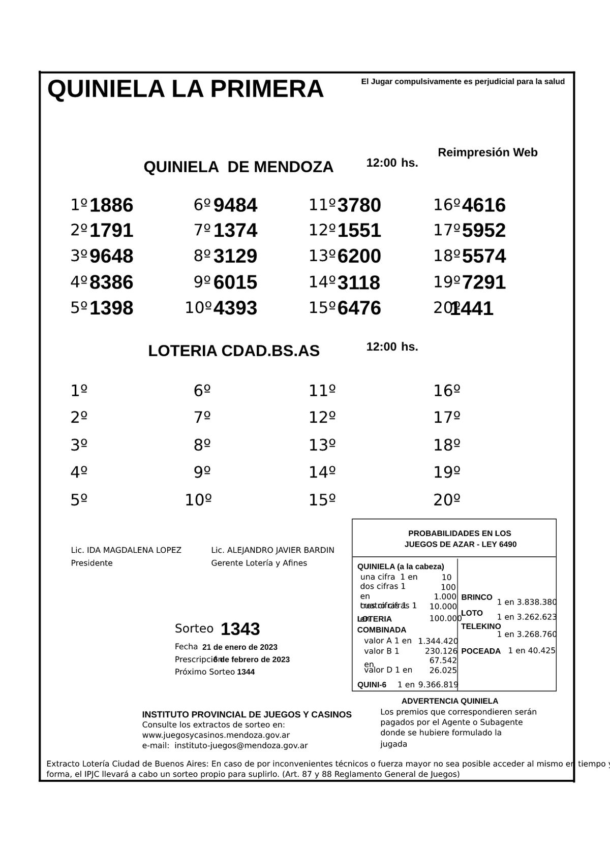 Resultados Quiniela de Mendoza: Nocturna del 20 de enero 2023