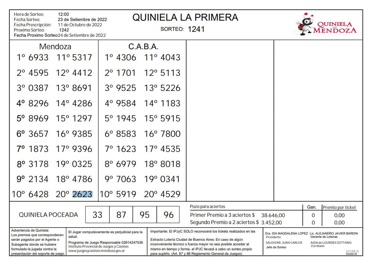 Este viernes 23 de septiembre se llevó a cabo el sorteo número 1241 de la Quiniela de Mendoza en su edición La Primera y el número ganador resultó ser el 6933. Mientras que en el segundo lugar salió el 4595y en el tercer lugar el 0387.