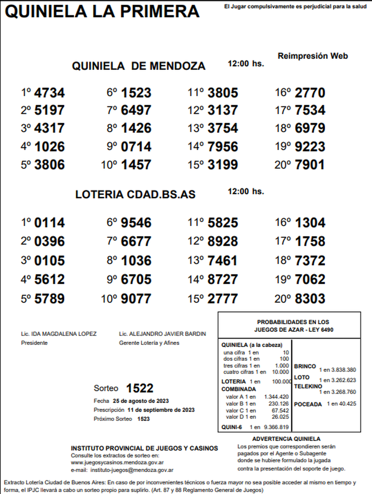Resultados de la Quiniela de Mendoza en su edición Primera.