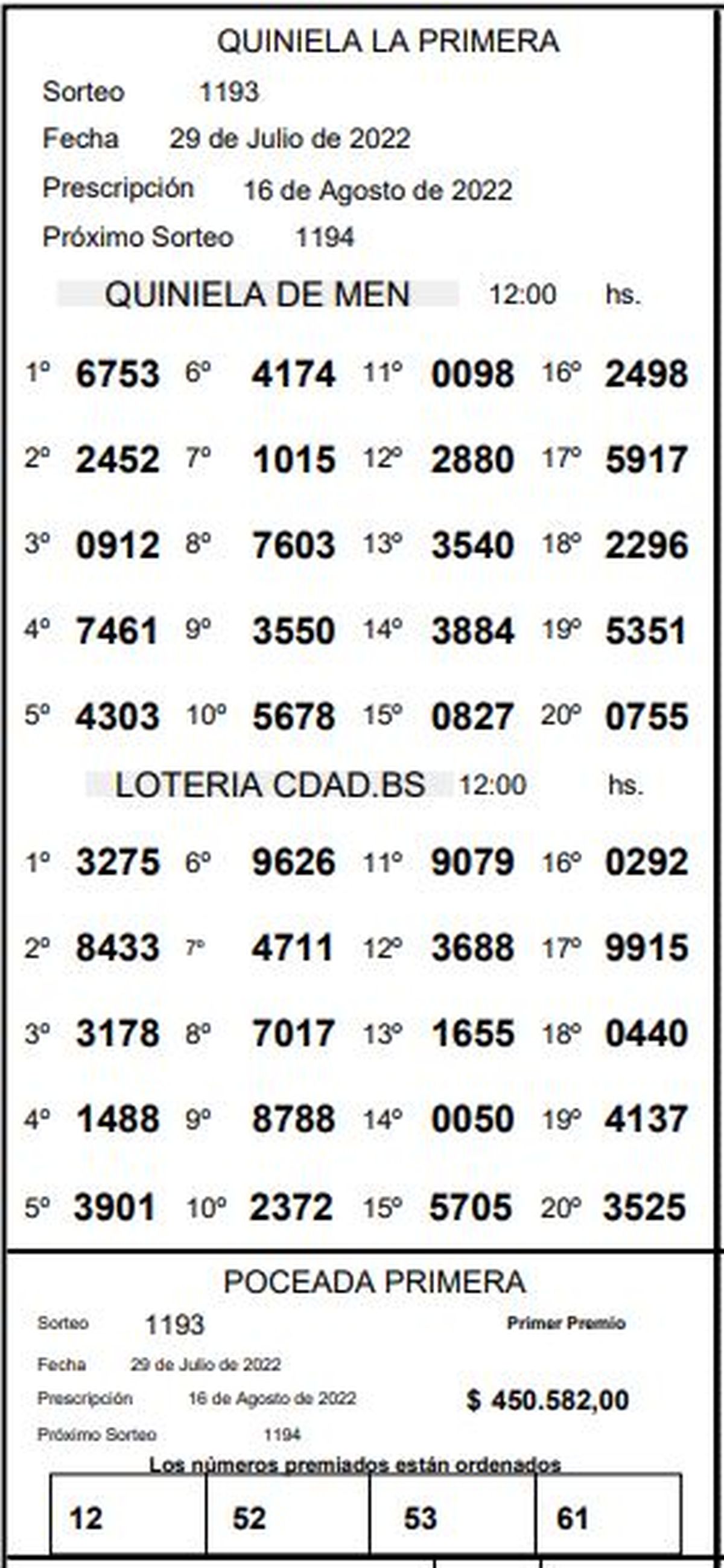 Este viernes 29 de julio se llevó a cabo el sorteo número 1193 de la Quiniela de Mendoza en su edición La Primera y el número ganador resultó ser el 6753. Mientras que en el segundo lugar salió el 2452 y en el tercer lugar el 0912.