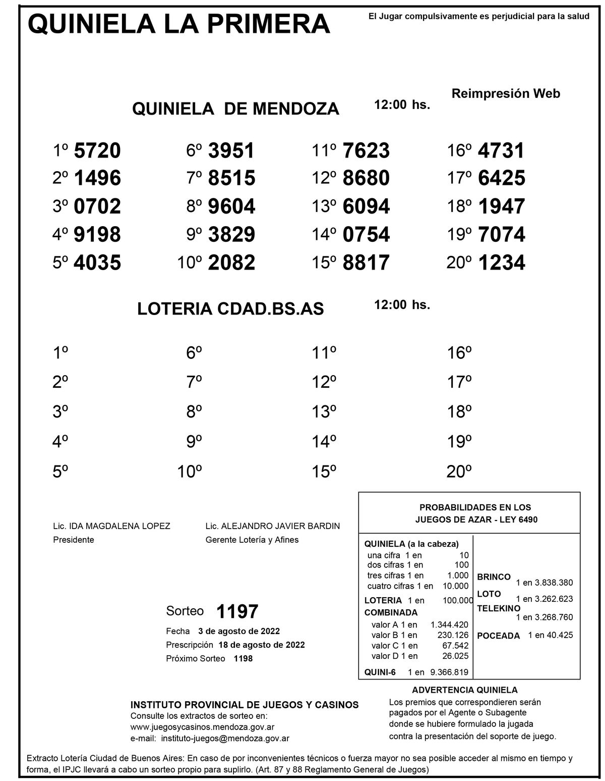 Este miércoles 3 de agosto se llevó a cabo el sorteo número 1197 de la Quiniela de Mendoza en su edición La Primera y el número ganador resultó ser el 5720. Mientras que en el segundo lugar salió el 1496 y en el tercer lugar el 0702.