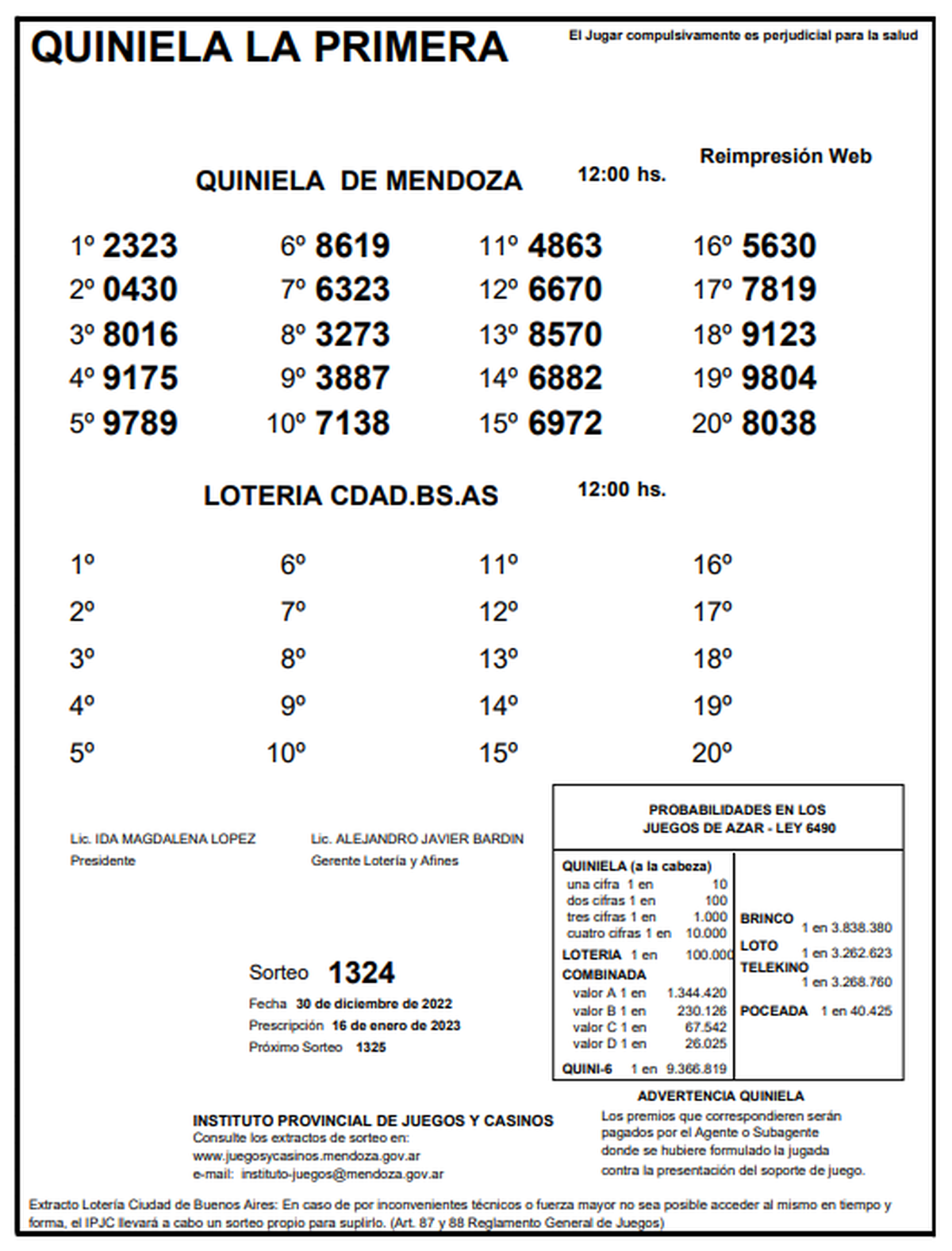 Este viernes 30 de diciembre se llevó a cabo el sorteo número 1324 de la Quiniela de Mendoza en su edición La Primera y el número ganador resultó ser el 2323. Mientras que en el segundo lugar salió el 0430 y en el tercer lugar el 8016.