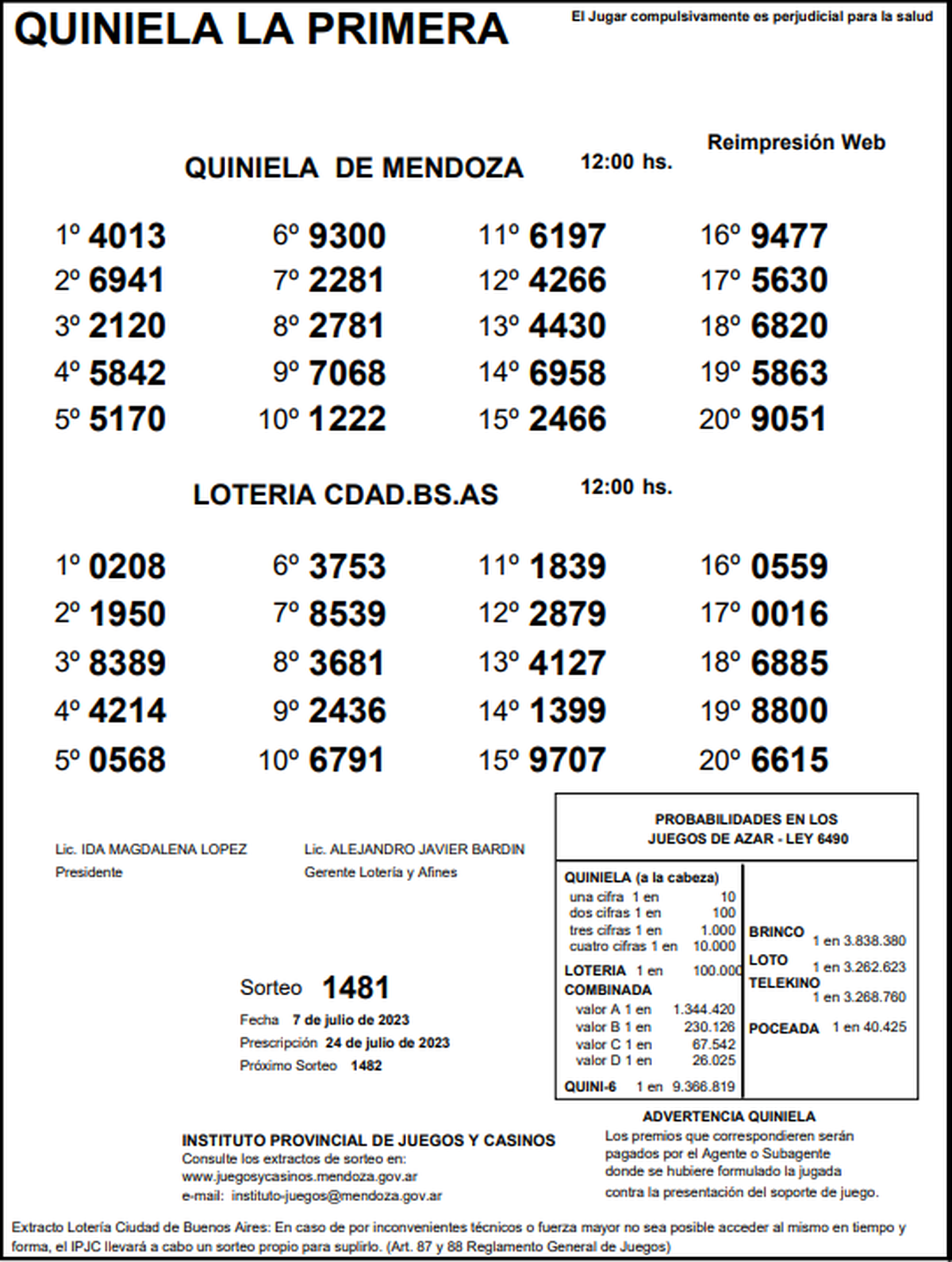 Resultados de la Quiniela de Mendoza en su edición Primera.