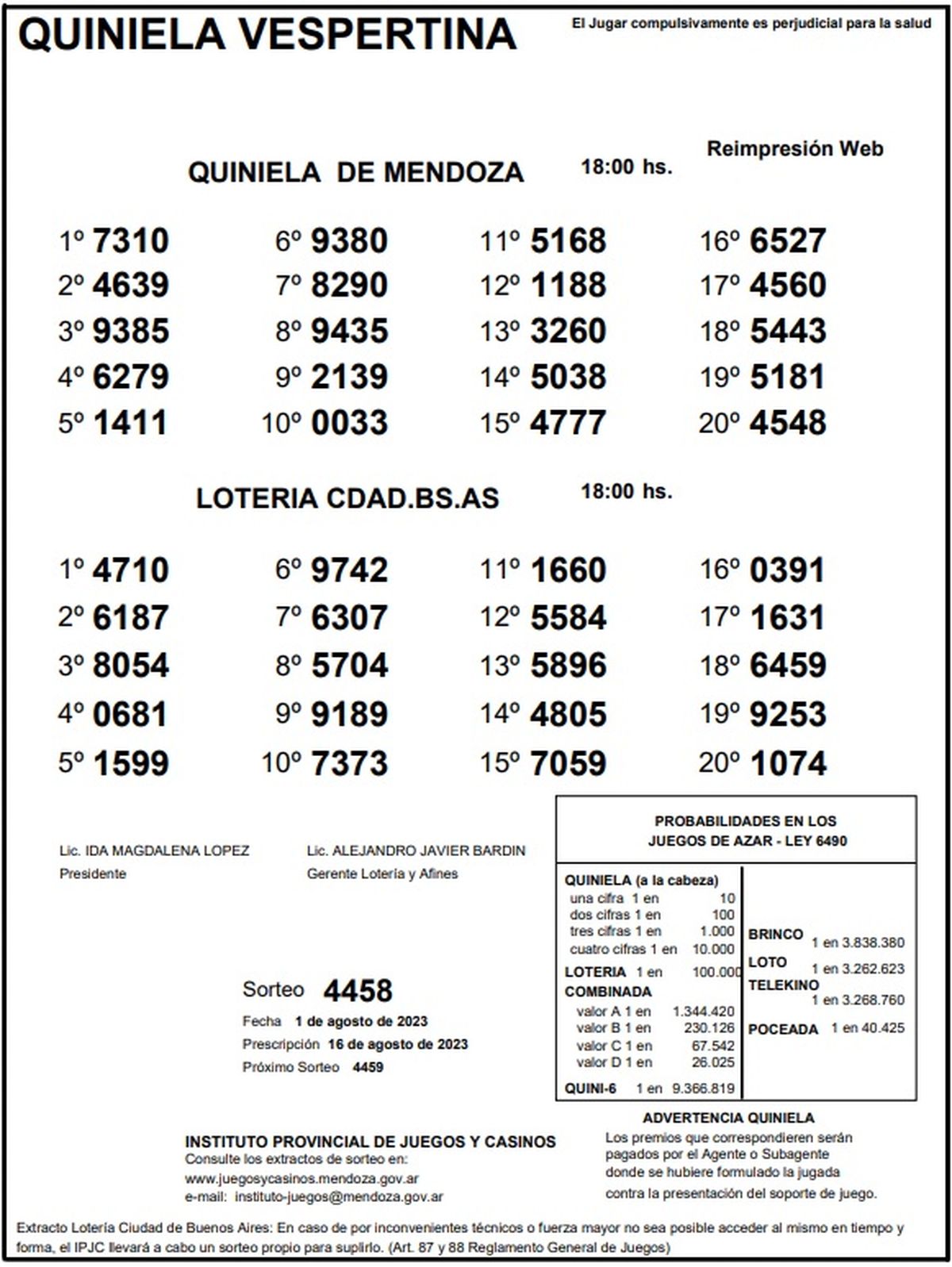 Quiniela de Mendoza: resultados de la Vespertina de hoy, 1 de agosto de 2023