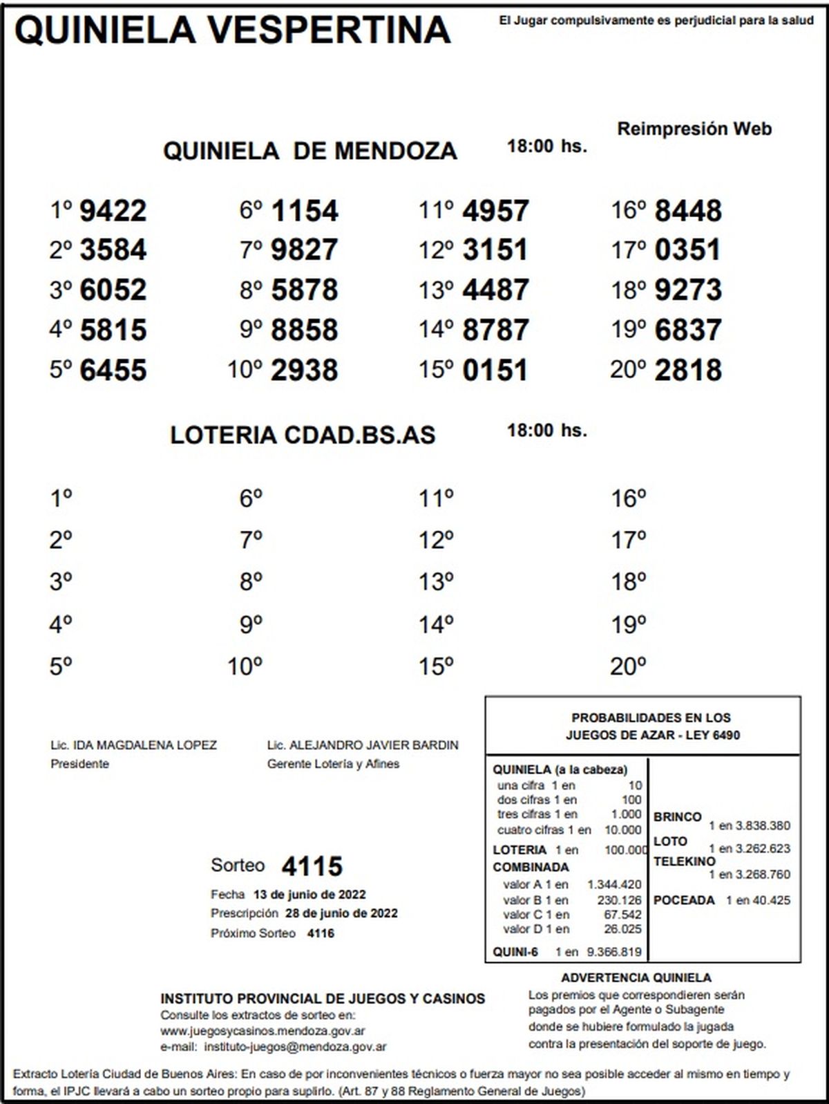 Este lunes 13 de junio se realizó el sorteo número 4115 de la Quiniela de Mendoza en su edición Vespertina y el número ganador resultó ser el 9422. Mientras que en el segundo lugar salió el 3584 y en el tercer lugar el 6052.