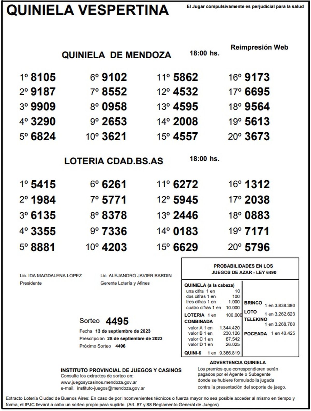 Quiniela de Mendoza: resultados de la Vespertina de hoy, 13 de setiembre de 2023
