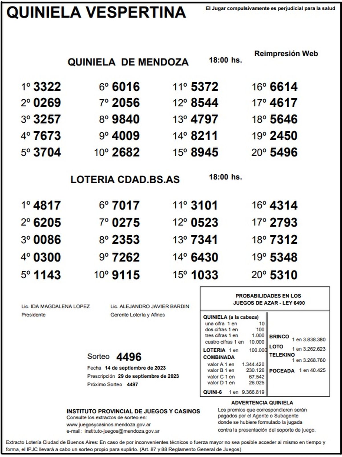 Quiniela de Mendoza: resultados de la Vespertina de hoy, 14 de setiembre de 2023