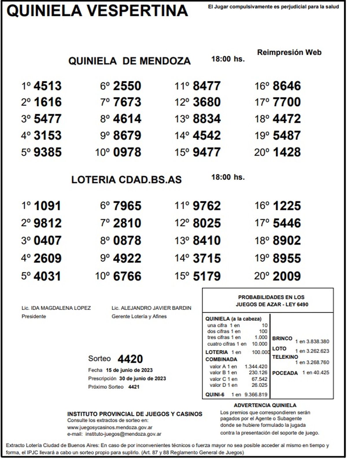 Quiniela de Mendoza: resultados de la Vespertina de hoy, 15 de junio de 2023