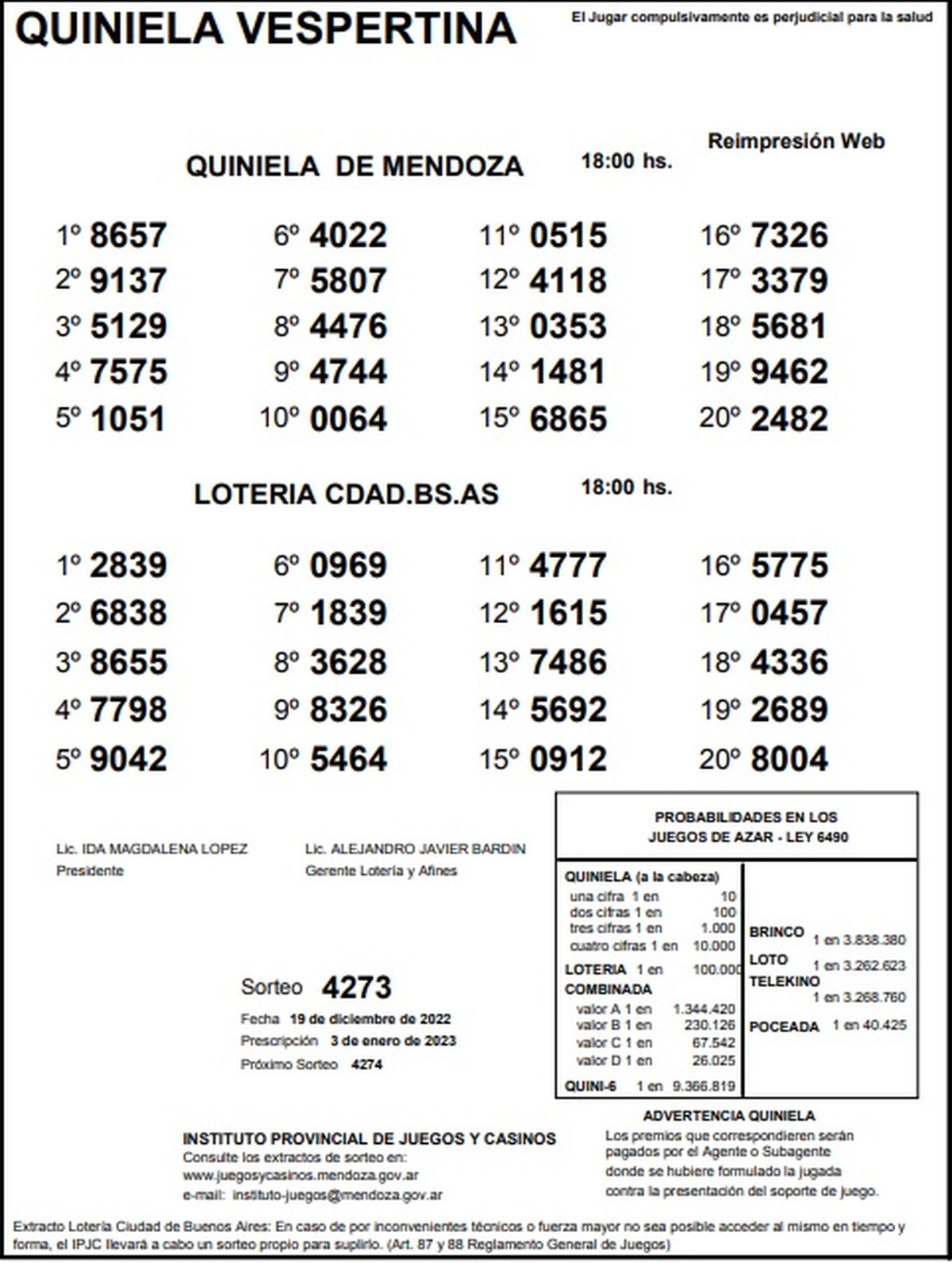 Quiniela de Mendoza: resultados de la Vespertina de hoy, 19 de diciembre