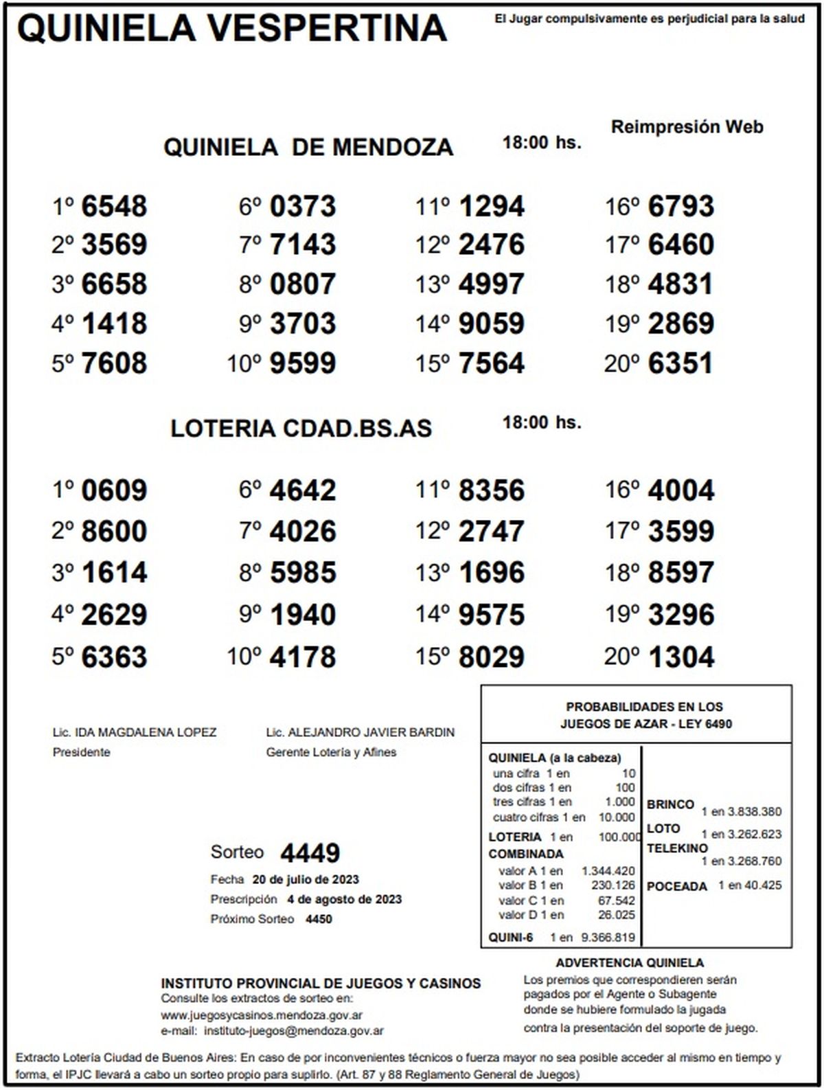 Quiniela de Mendoza: resultados de la Vespertina de hoy, 20 de julio de 2023
