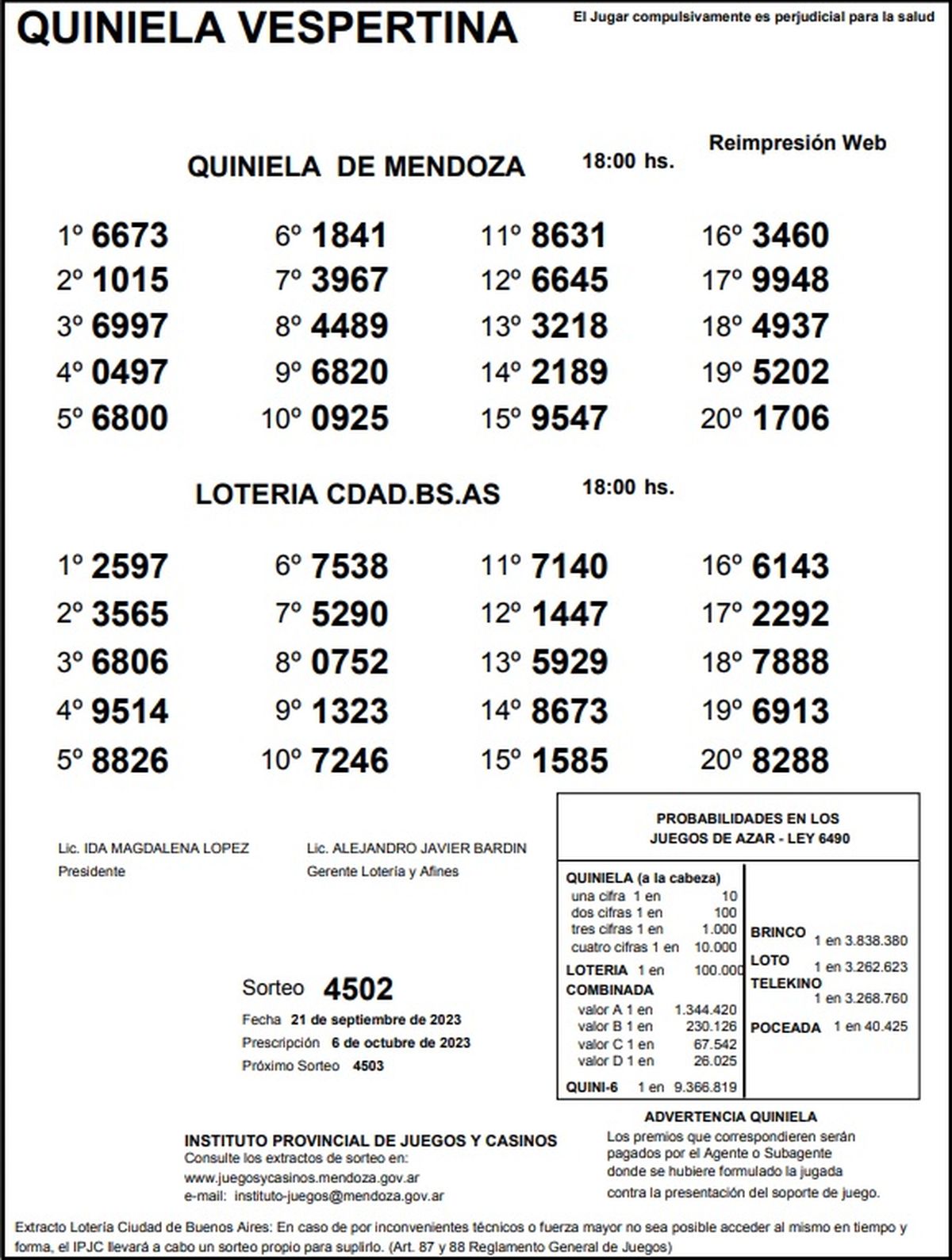 Quiniela de Mendoza: resultados de la Vespertina de hoy, 21 de setiembre de 2023