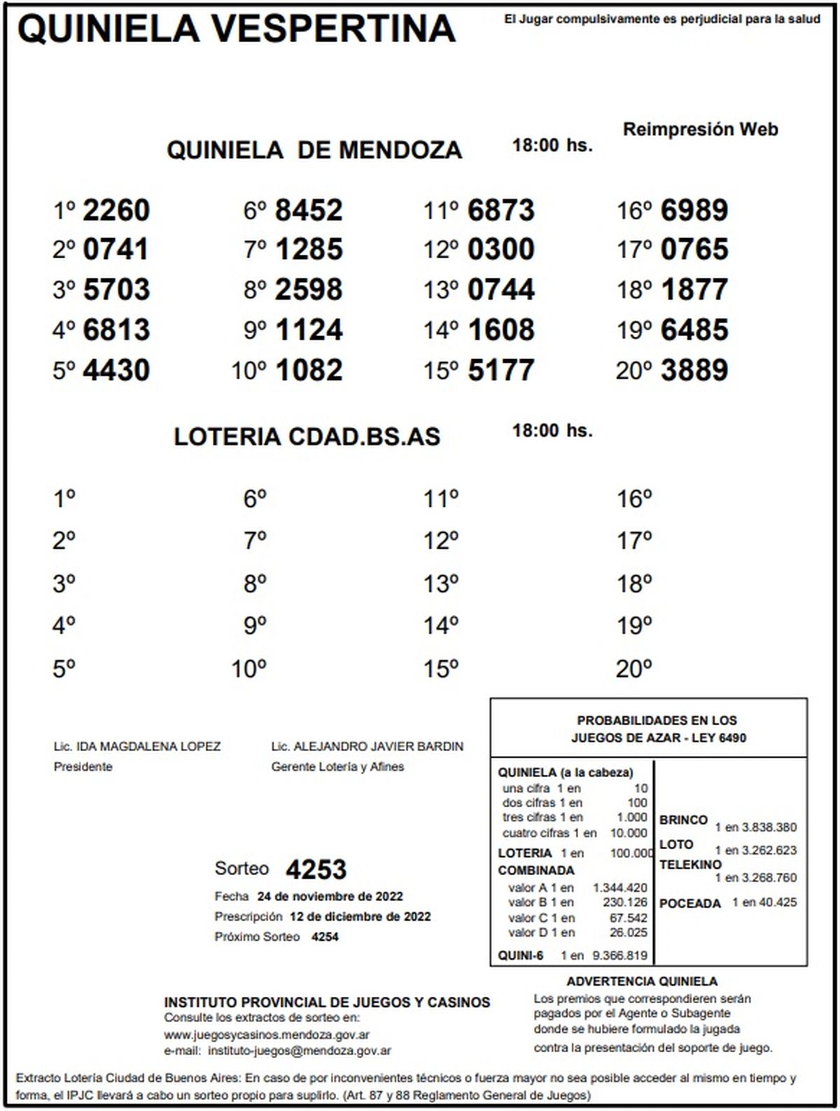 Quiniela de Mendoza: resultados de la Vespertina de hoy, 24 de noviembre de 2022