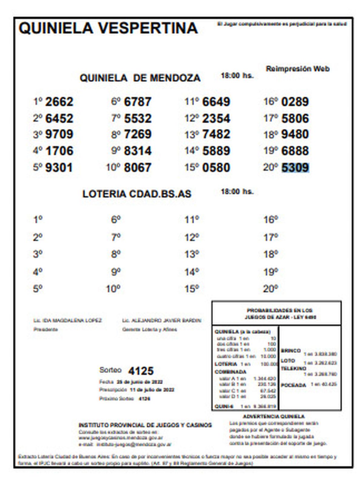 Quiniela de Mendoza: resultados de la Vespertina de hoy, 25 de junio de 2022