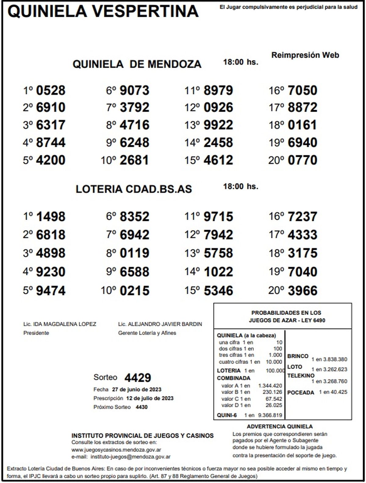 Quiniela de Mendoza: resultados de la Vespertina de hoy, 27 de junio