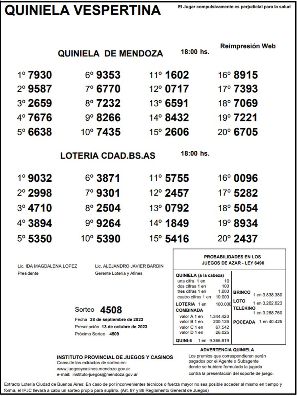 Quiniela de Mendoza: resultados de la Vespertina de hoy, 28 de setiembre de 2023