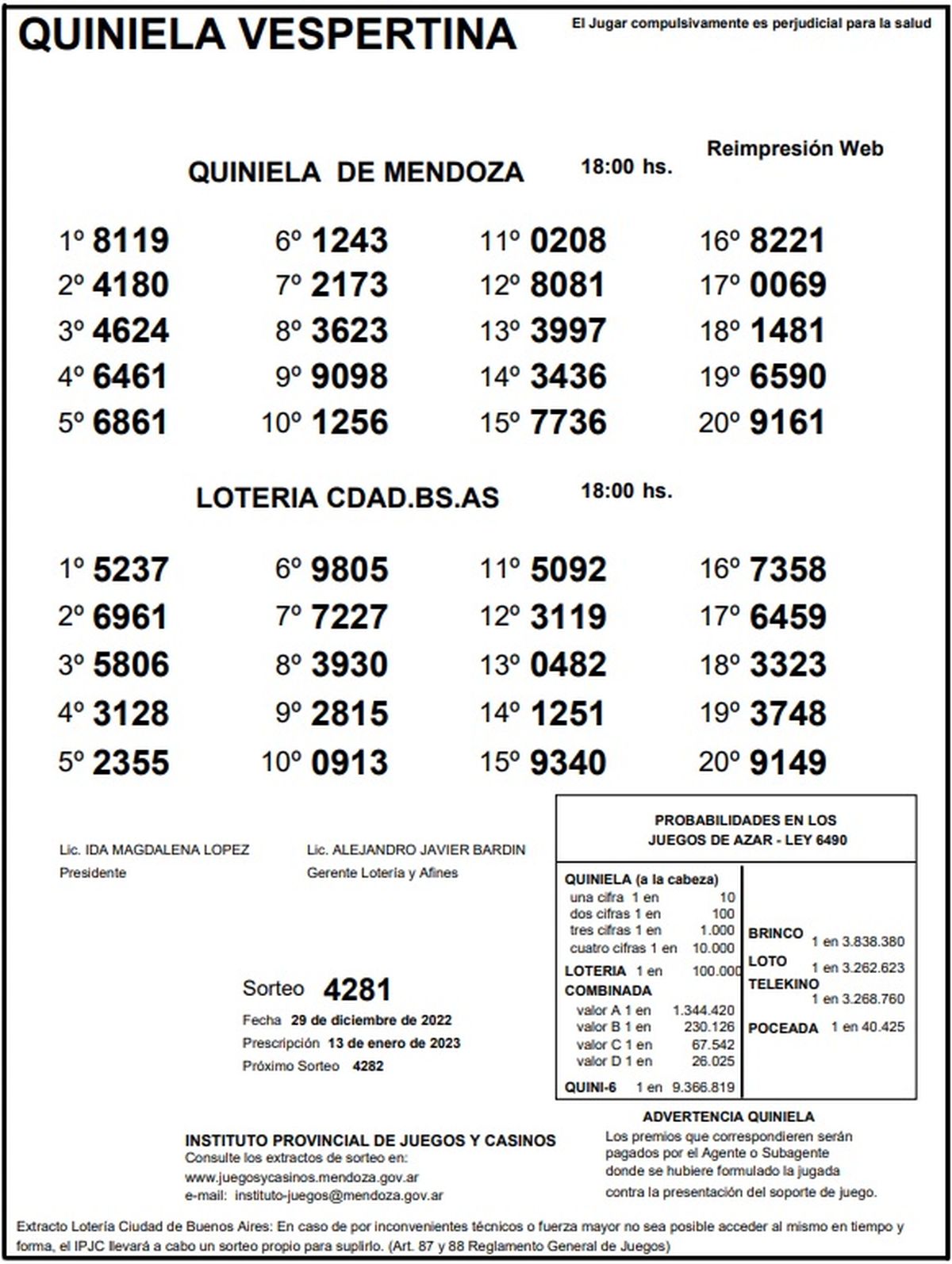 Quiniela de Mendoza: resultados de la Vespertina de hoy, 29 de diciembre de 2022