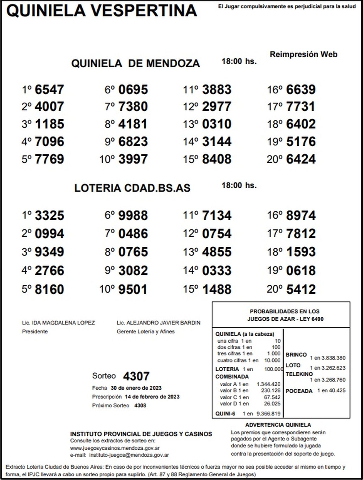 Quiniela de Mendoza: resultados de la Vespertina de hoy, 30 de enero de 2023