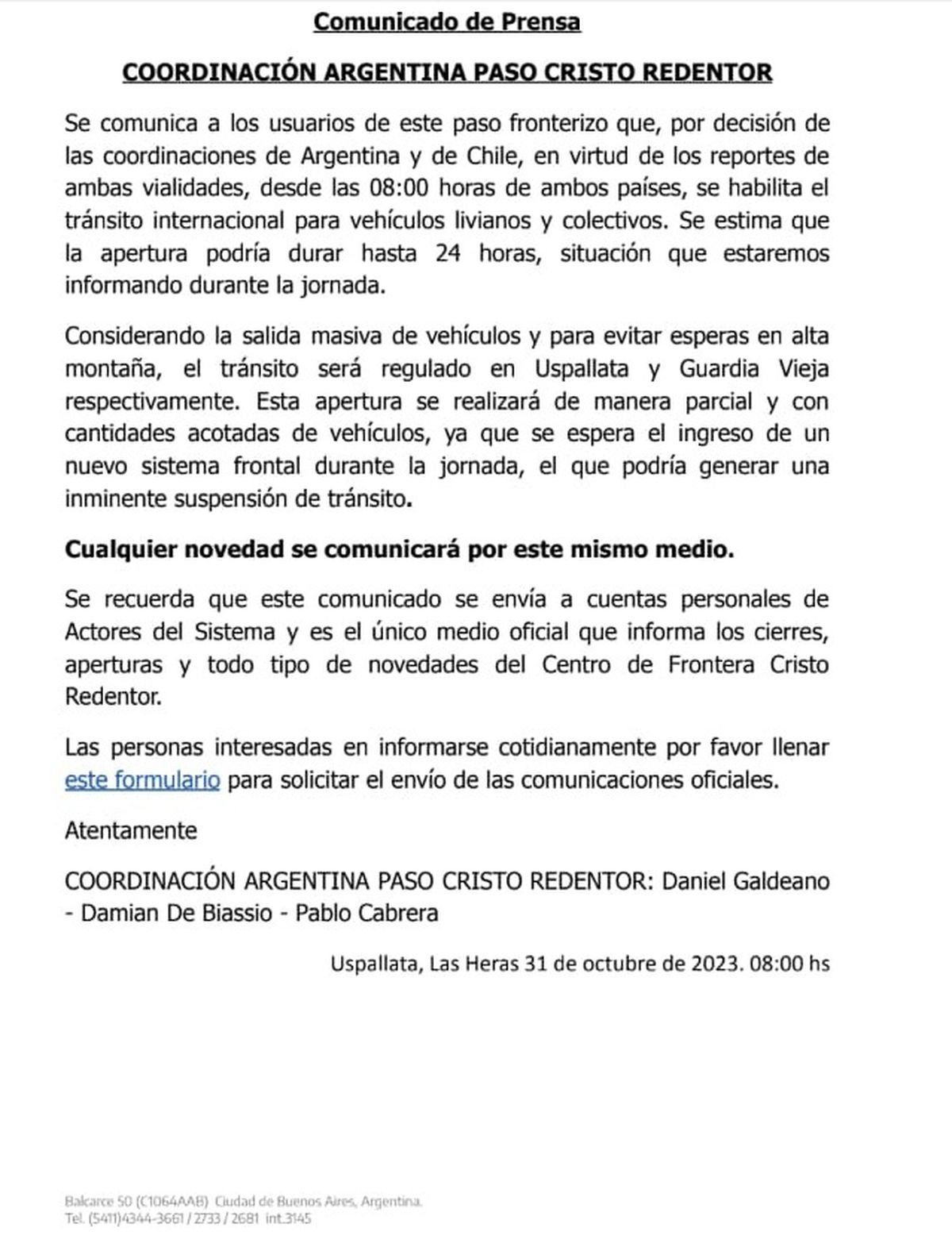 Las autoridades de Argentina y Chile informaron que a partir de las 8 de este martes se reabre por algunas horas el Sistema Integrado Cristo Redentor, tras el cierre que había sido provocado por las condiciones climáticas adversas.