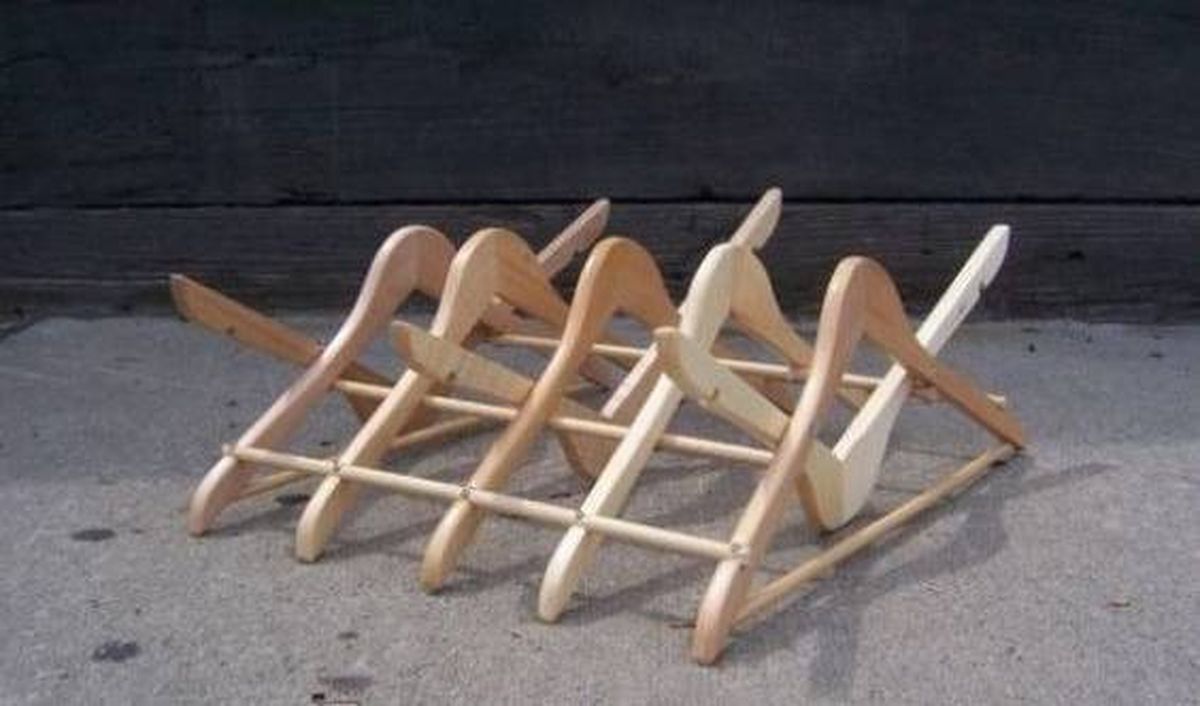 Para empezar toma las perchas de madera y sácales los ganchos de metal para que solo te quede la estructura de madera. Luego ubica cinco perchas como base y sobre las ranuras que tienen en cada extremo pega una varilla de madera que encaje perfectamente en este espacio. Es decir que en este paso usarás dos varillas, una de cada lado.