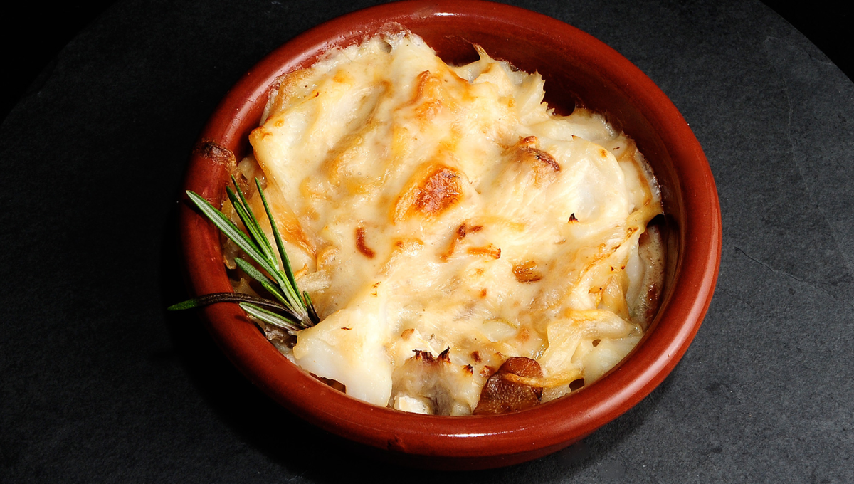 - En una bandeja para horno, colocar una base de papas, luego el bacalao y terminar con la cebolla. Hornear a 180° durante 15 minutos.