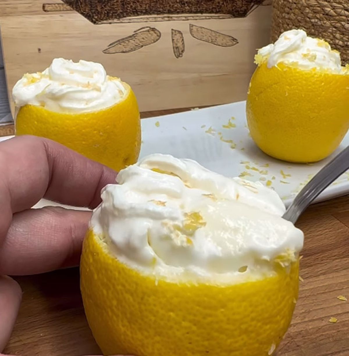 - Rellenamos los limones y decoramos con la crema de leche batida y ralladura de limón.