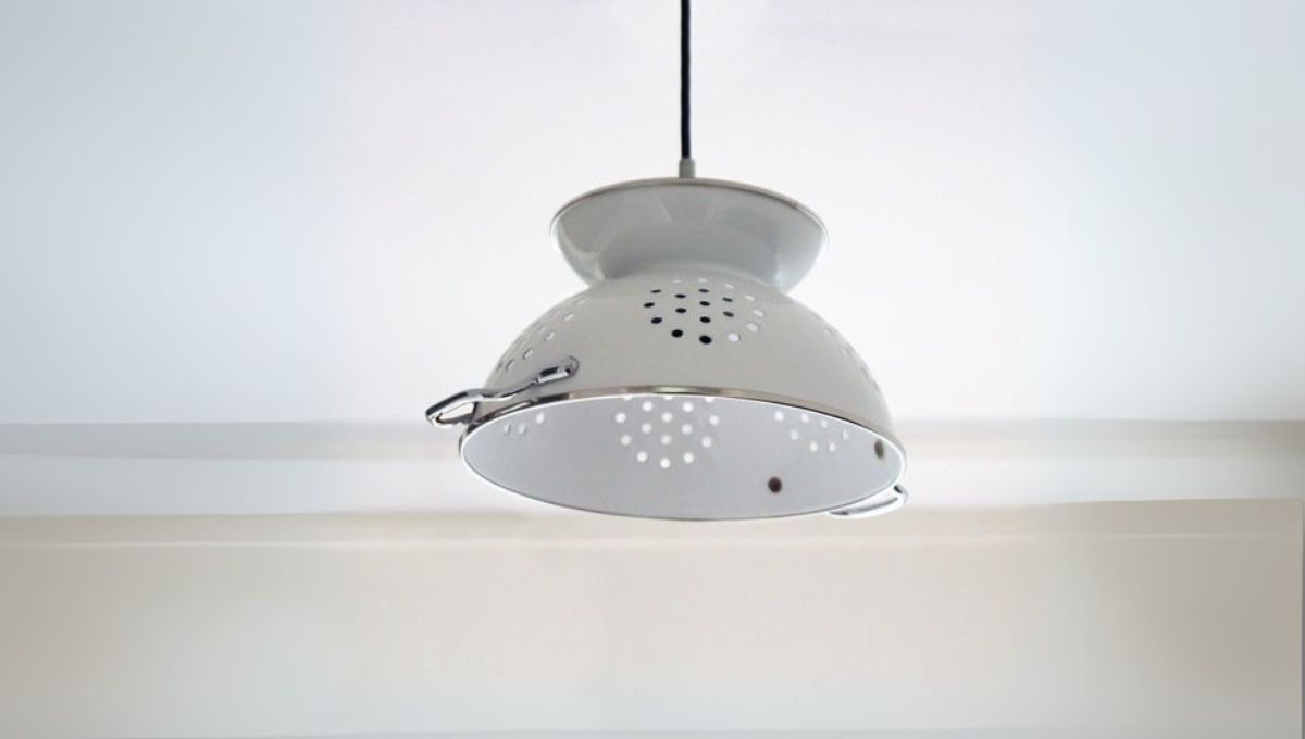 En este caso un utensilio de cocina reciclado puede convertirse en una pieza central de un espacio en tu hogar, como lo es una lámpara. Además, puedes jugar con los motivos que genera la luz traspasando los agujeros del colador.