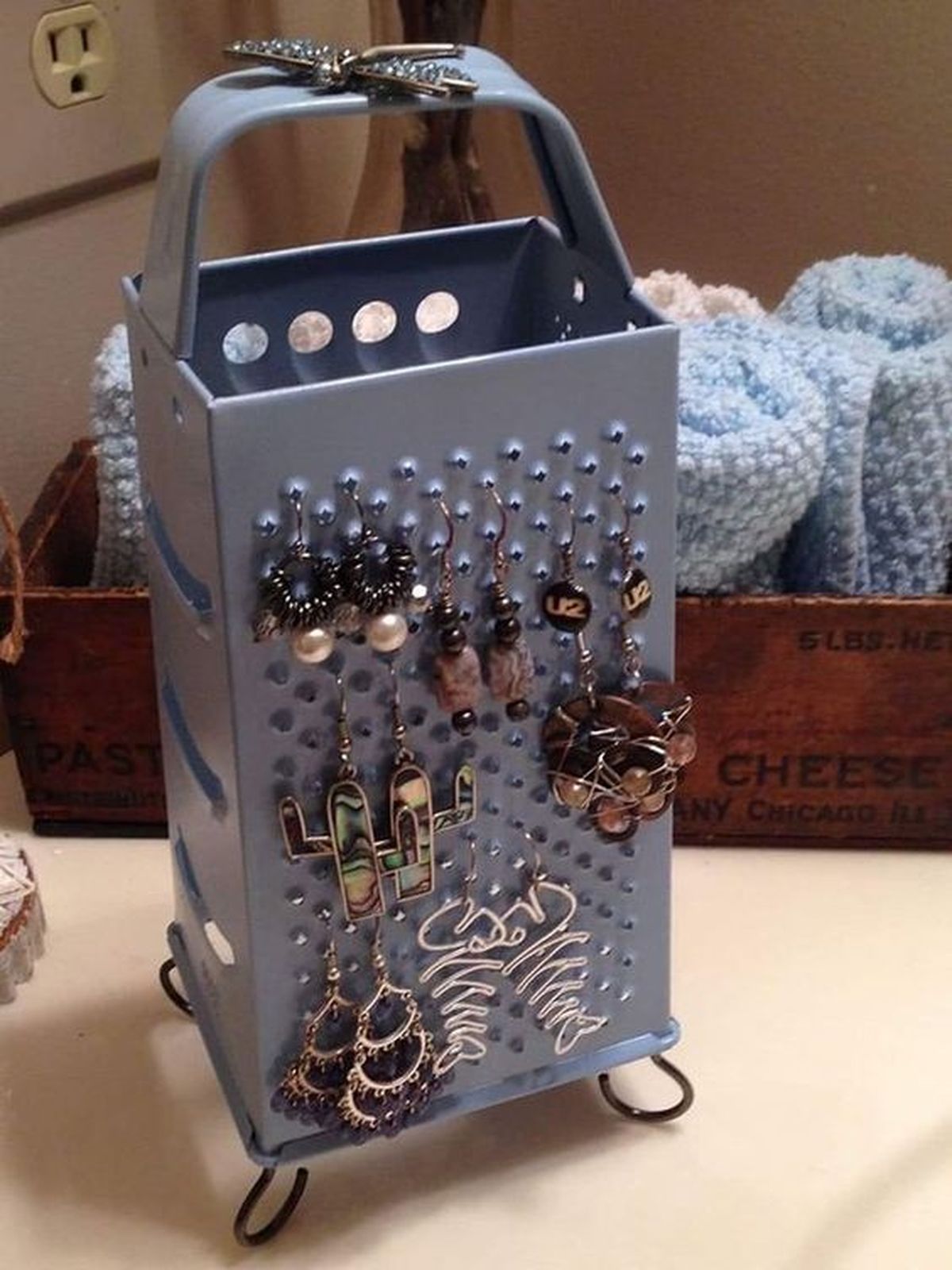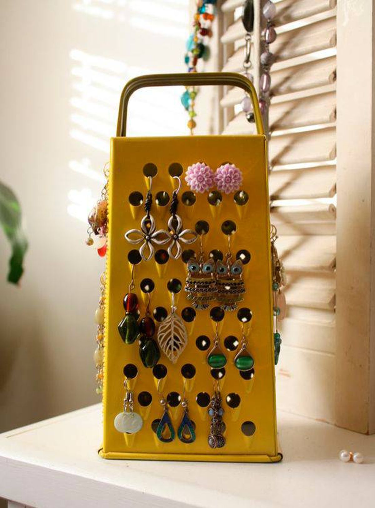 Si tienes un rallador de cocina viejo y algo oxidado, no lo tires y conviértelo en un lindo alhajero para tener tus aros, collares y accesorios a mano.
