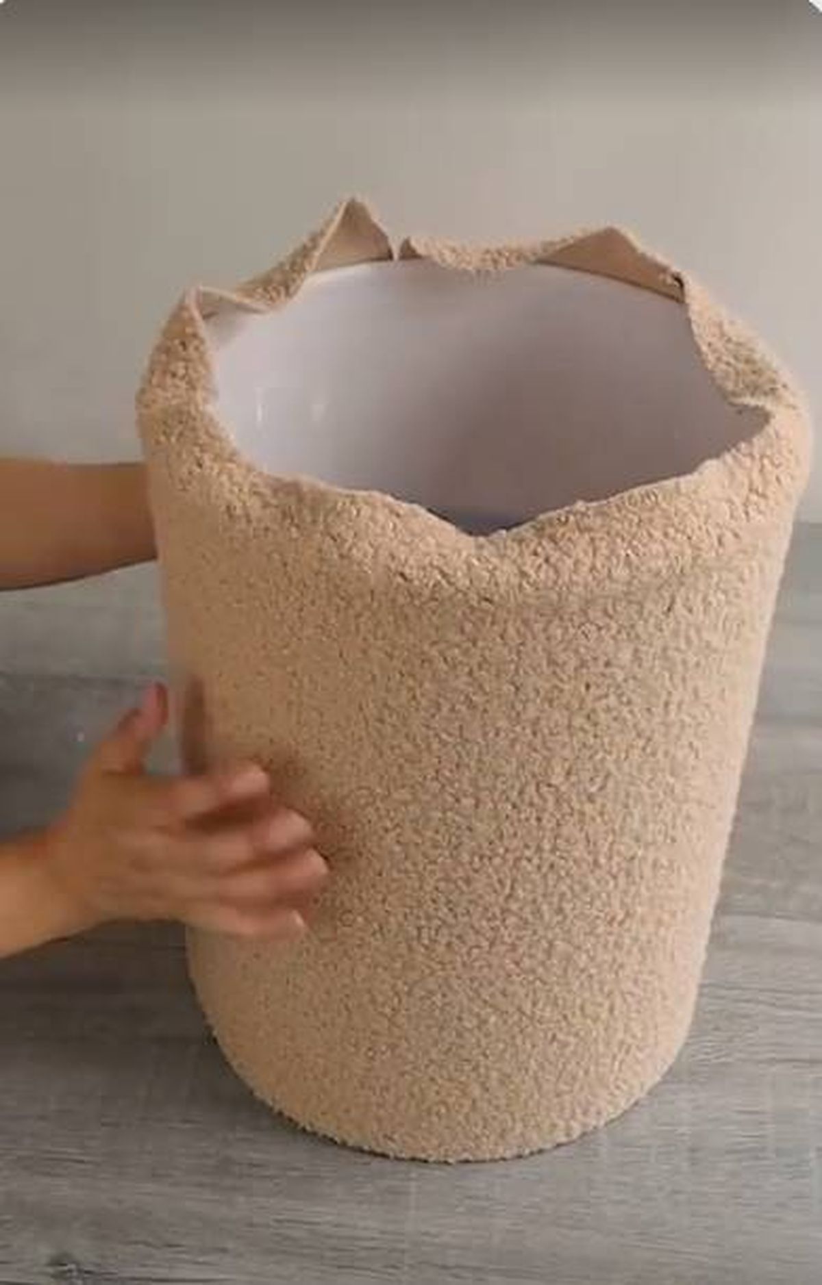 Para empezar toma el tacho de pintura vacío y asegúrate de que esté en condiciones. Luego con la tela que vayas a utilizar, toma las medidas necesarias, córtala y forra bien todo el exterior del tacho. Fíjate que quede bien prolijo y deja secar.