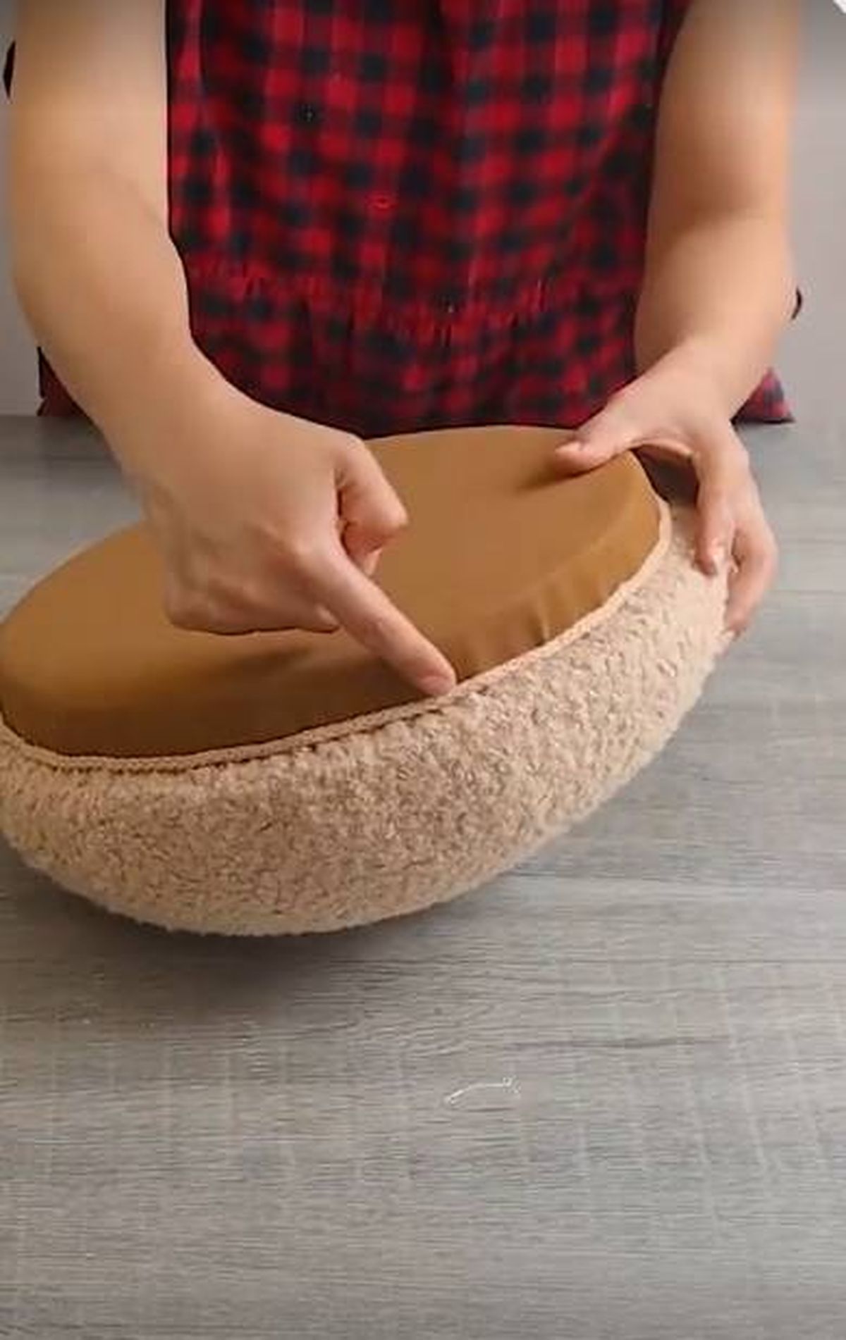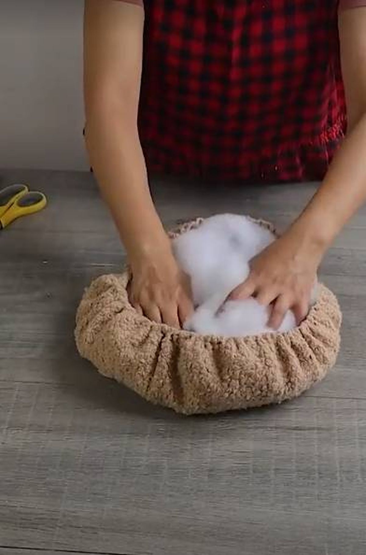Para el almohadón toma más tela, recorta el tamaño necesario, hilvana un poco los bordes como para formar de a poco una almohada y rellénalo de guata. Luego termina de hilvanar y sujetar más el relleno y para cerrarlo introduce la tapa del balde y cierra la almohada. De esta manera, quedará mullido de un lado y del otro quedará liso y chato gracias a la tapa.