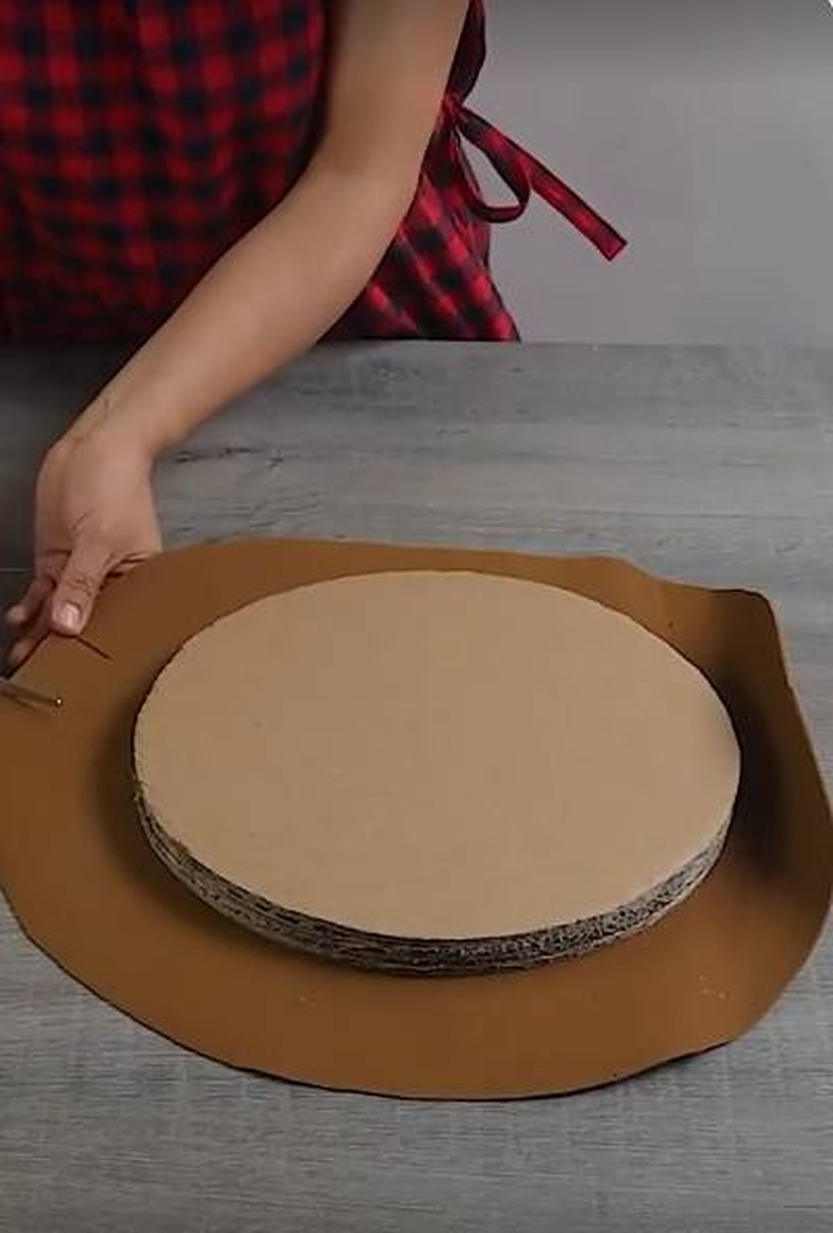 Luego toma el cartón y recorta tres círculos del tamaño de la circunferencia del balde, pégalos uno encima del otro y fórralos con la tela, puede ser la misma u otra. Esto le dará más firmeza y rigidez al almohadón del sillón.