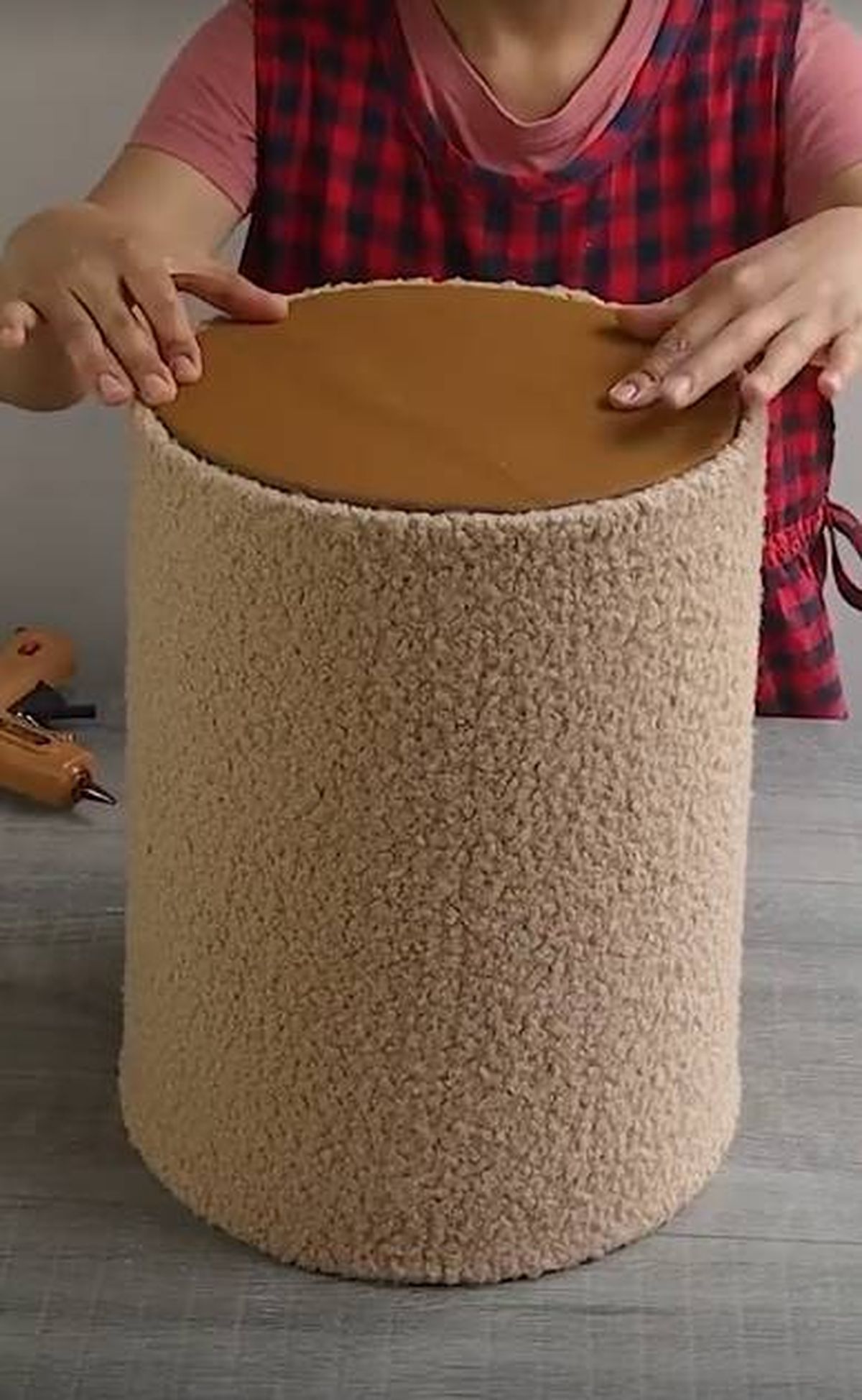 Después toma el almohadón y en la parte chata pégale la base hecha previamente con cartón. Para terminar coloca y pega bien el asiento a la base del balde y listo. Te habrá quedado un lindo y funcional sillón para decorar los cuartos o el living de la casa.