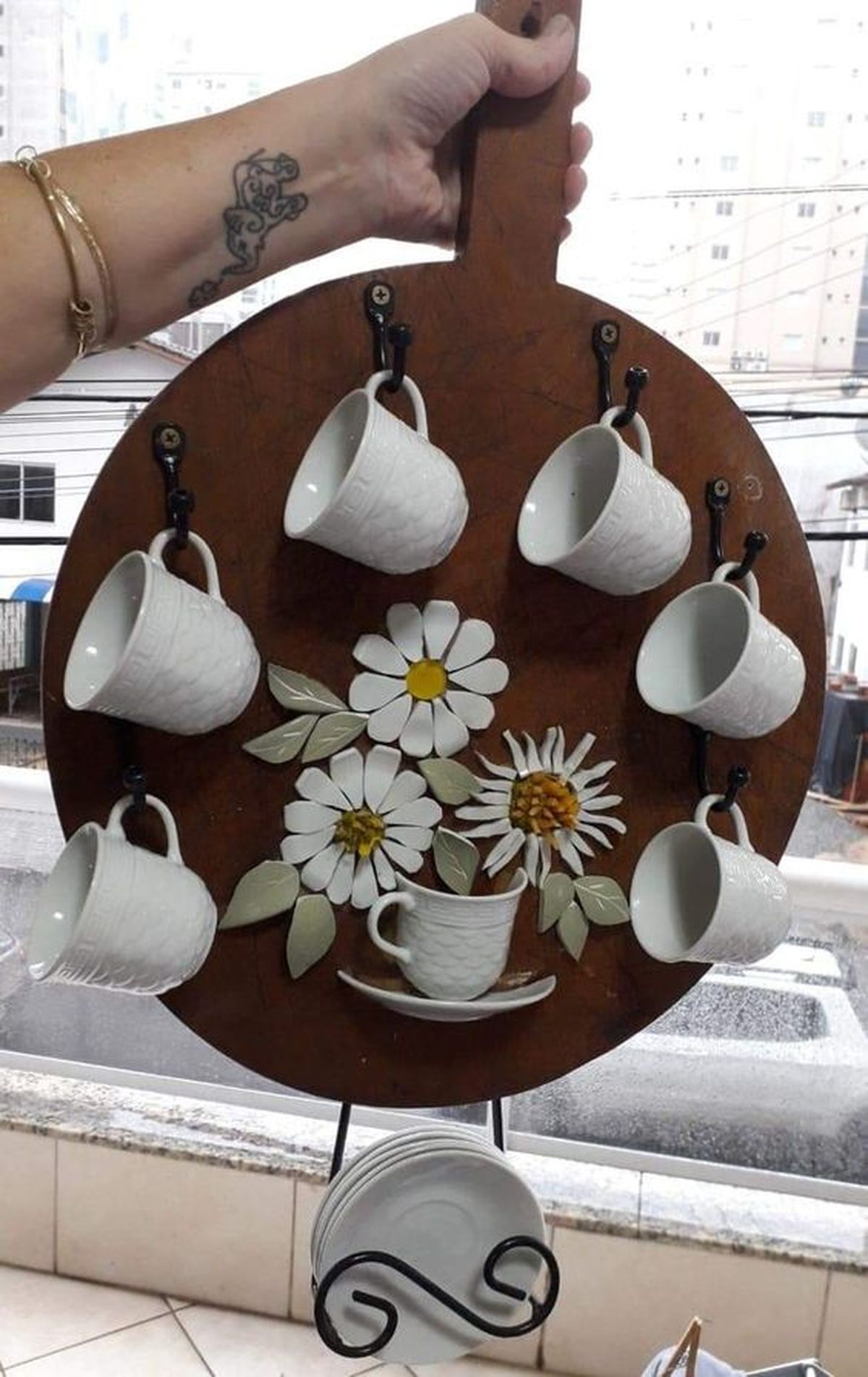 Una maravillosa manera de reciclar la tabla de madera que no usas más en casa es esta idea DIY donde podrás crear un decorativo estante para colgar las tazas que usas habitualmente para tomar el desayuno o media tarde.