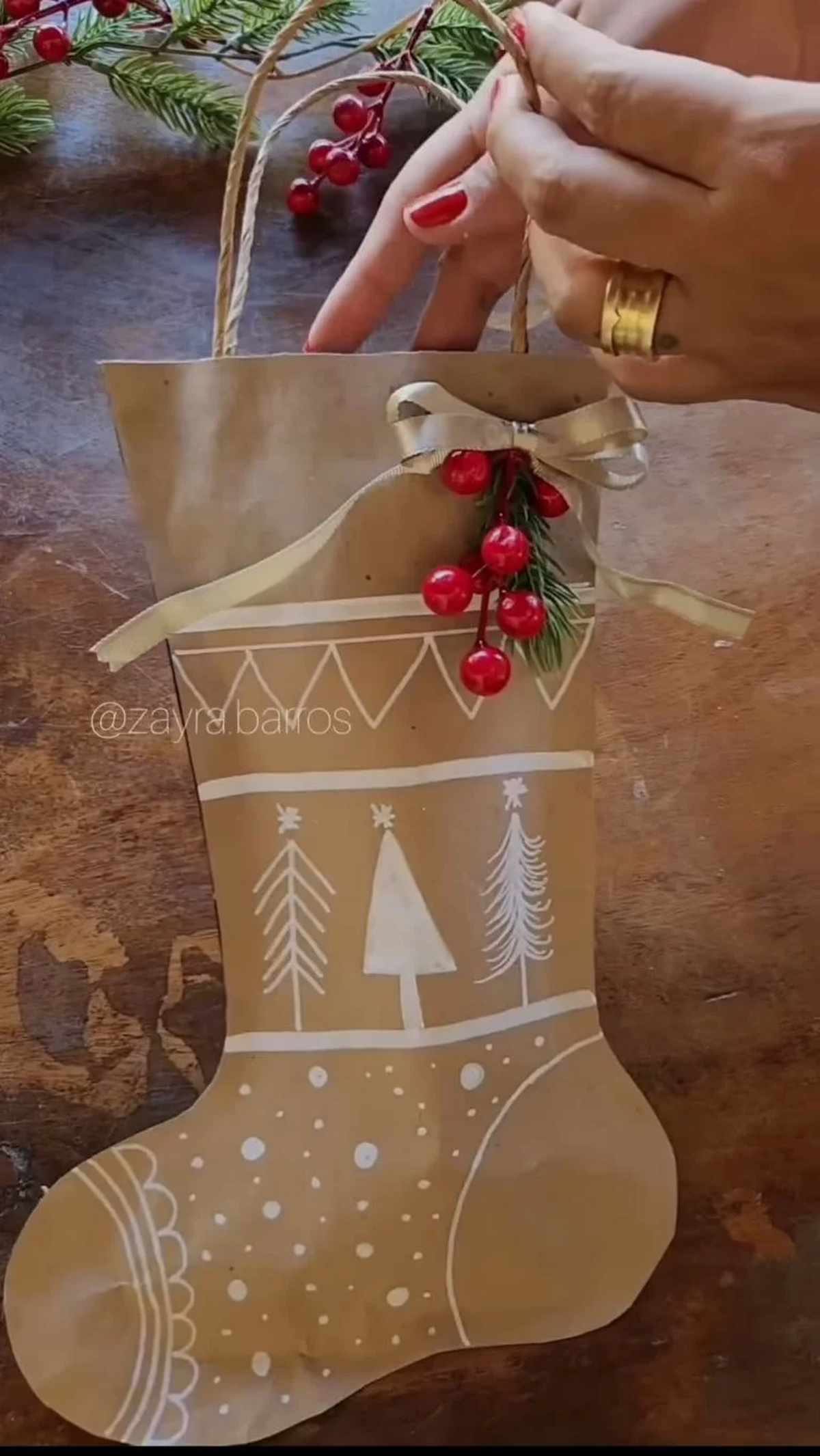 - Estirá la bolsa de papel y con ayuda de un lápiz y el molde de una bota navideña, calcá la figura en la superficie. Luego, cortá la parte superior para reutilizar las tiras de la bolsa y cortá la forma del adorno navideño.