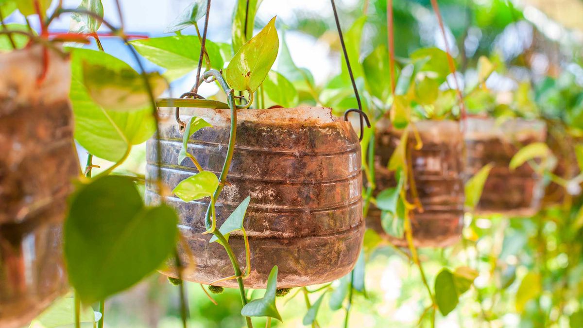 Corta la parte superior de una botella de plástico y haz agujeros en la base para el drenaje. Llena con tierra y planta tus plantas favoritas.