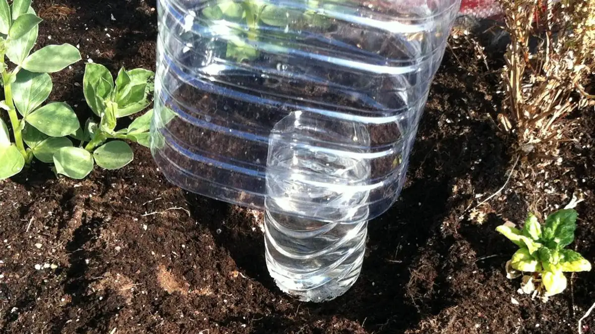 Utiliza dos botellas de agua (una grande de 5 litros y una más pequeña de 1,5 o 2 litros) para crear un sistema de riego por goteo solar. Entierra parcialmente la botella pequeña como depósito de agua cerca de la planta y cubre con la botella grande para estabilizar. Alinea las bocas para facilitar el rellenado.