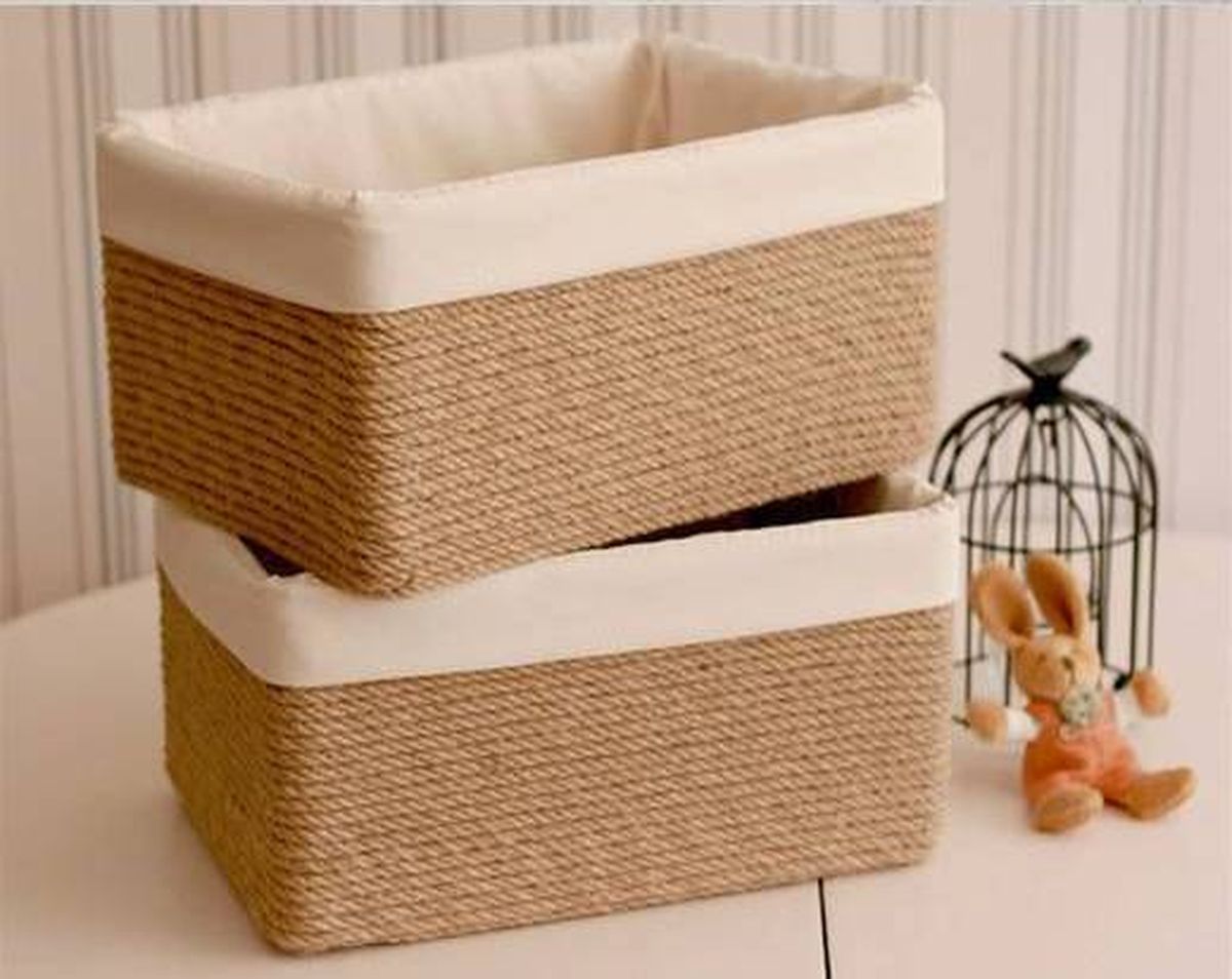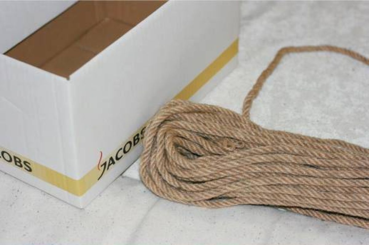 Comienza tomando la caja de cartón y en caso de que tenga tapa o algunas solapas, sácaselas. Luego empieza a forrarla con el hilo de yute grueso de abajo hacia arriba, a medida que vayas avanzando coloca pegamento para que quede bien adherido.