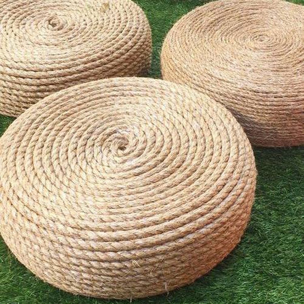 Después comienza a forrar la rueda con el hilo de yute grueso como se ve en la imagen y fíjate de que quede bien pegado. Cuando termines obtendrás hermosos asientos de piso para decorar el interior de tu casa.